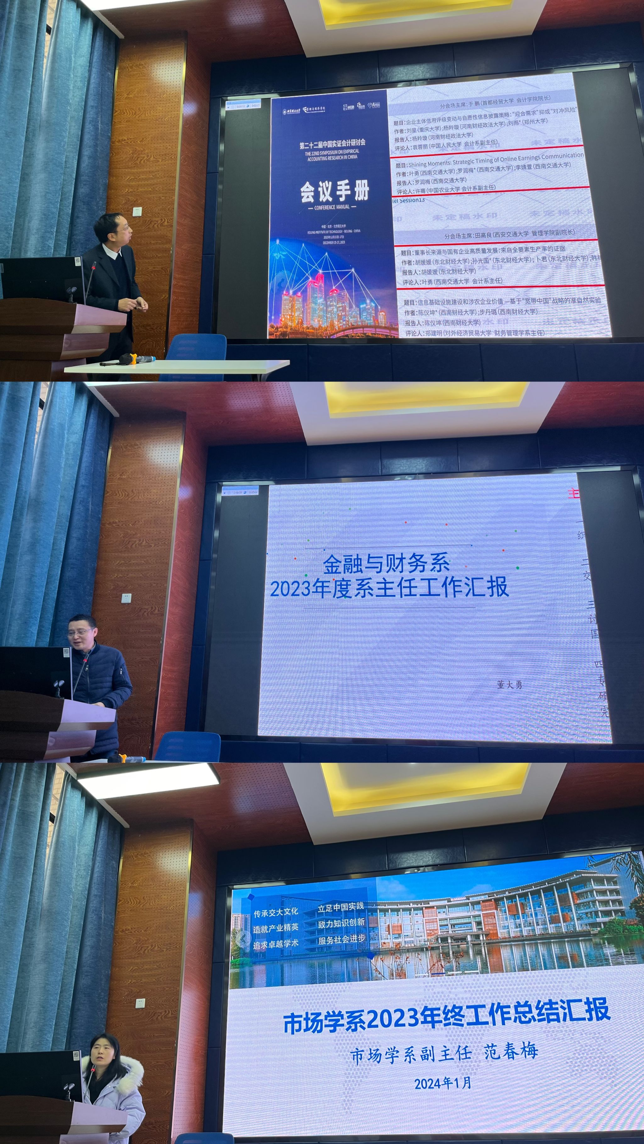 会议第三阶段,各学系正副主任、专业负责人进行了述职交流,会计学系、工程管理系、金融与财务学系、信息系统与运营管理系、市场学系、创新创业与管理学系、经济学系正副主任依次汇报了2023年的工作。