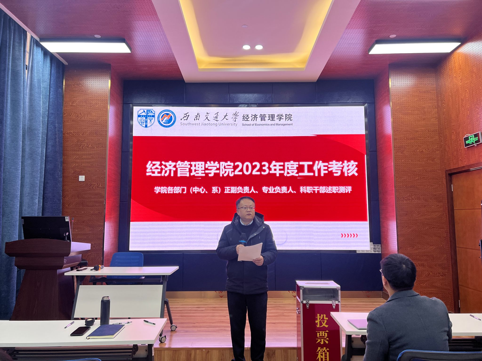 2024年1月2日下午2点,经济管理学院在九里校区0218会议室召开2023年度各部门(中心、系)正副负责人、专业负责人、科职干部工作述职评议考核会议。学院党政领导班子成员、各部门(中心、系)正副负责人、专业负责人、科职干部及教职工代表参加了会议,会议由学院党委书记郭强主持。