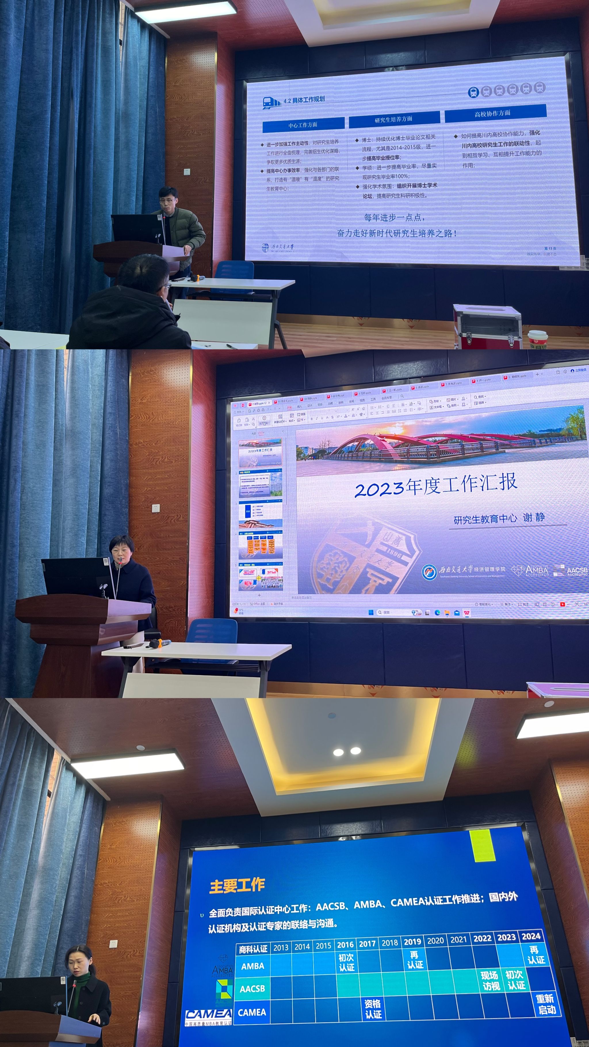 会议第一阶段,由各中心正副主任进行述职。学院研究生教育中心、本科教育中心、专业学位教育中心、国际认证中心、校友事务中心、国际交流与合作中心、实验中心等7个部门的正副负责人对本年度的主要工作、亮点与成绩、不足与改进和未来规划进行了陈述。