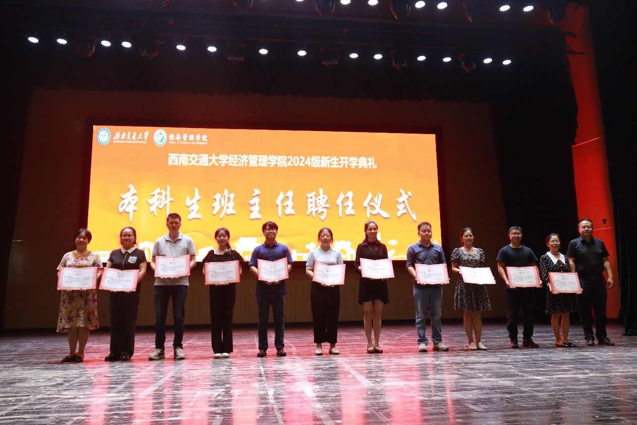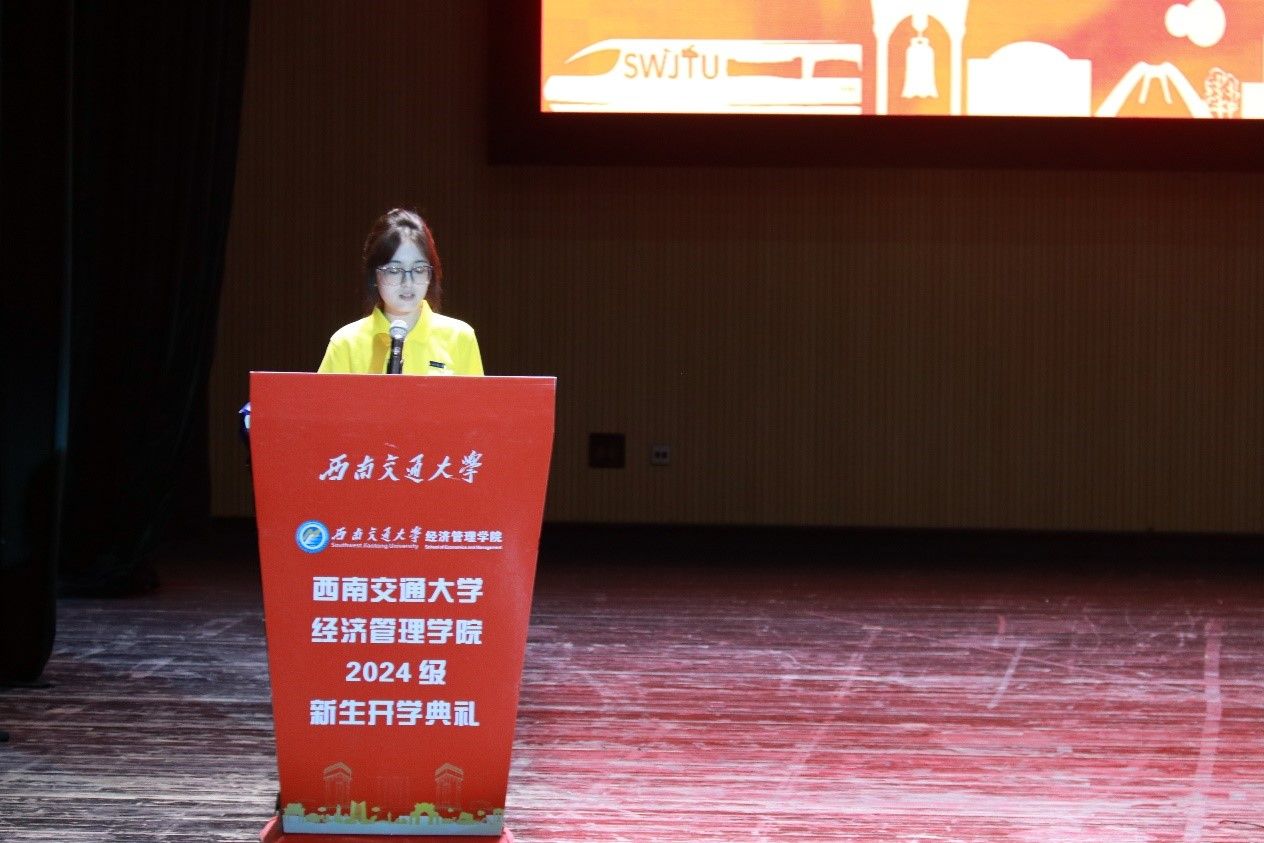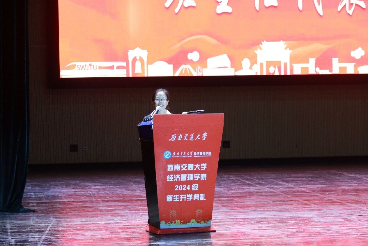 2024年8月31日晚,西南交通大学经济管理学院2024级新生开学典礼在学生大会堂隆重举行。出席本次开学典礼的领导和嘉宾有:学院党委书记郭强,院长韩科,学院党委副书记、纪委书记晏理斌,副院长李良、聂佳佳、马锋,以及学院各系、中心的教职工代表,各班班主任,2024级辅导员。活动由学院党委副书记余小英主持。