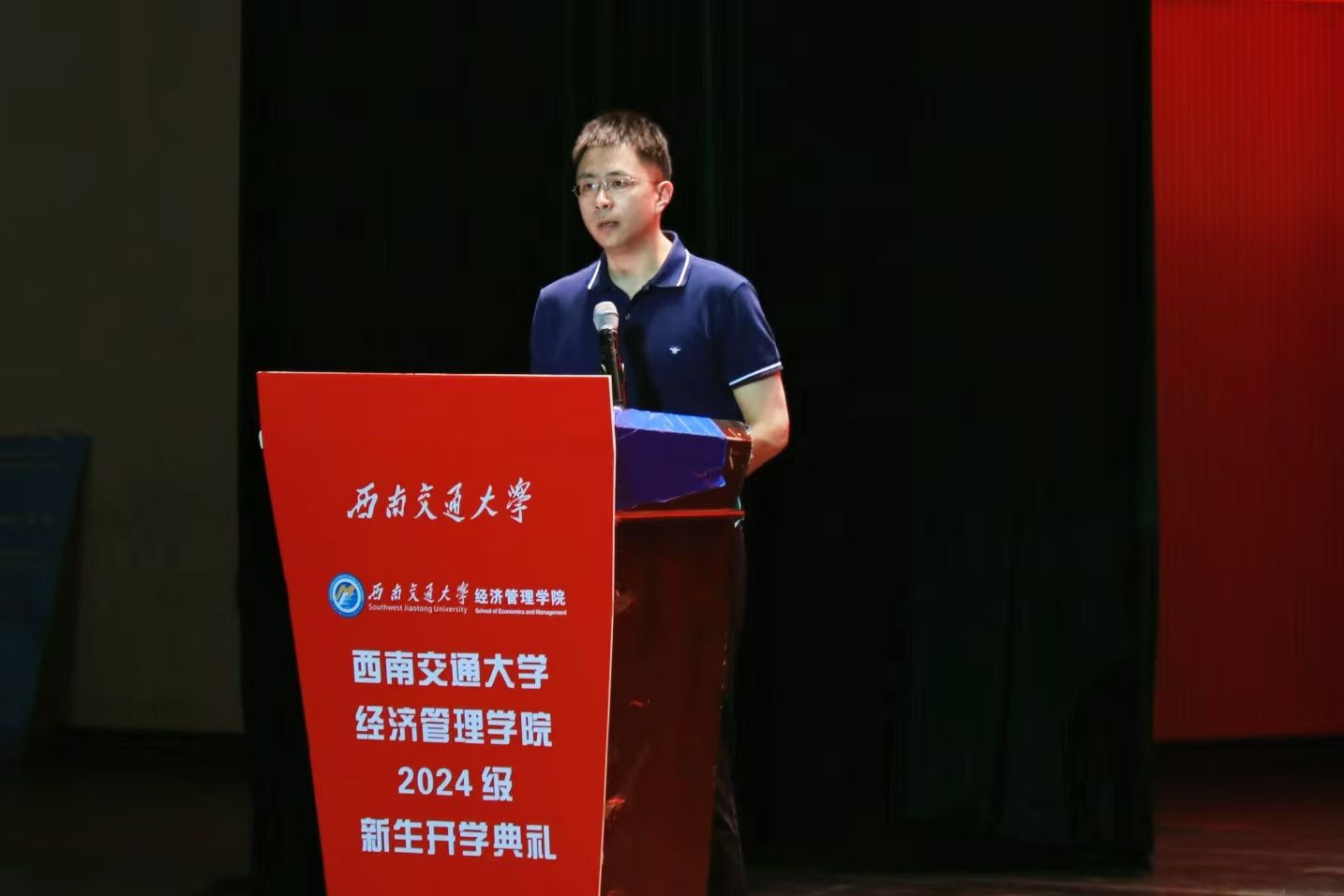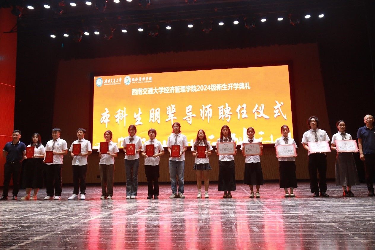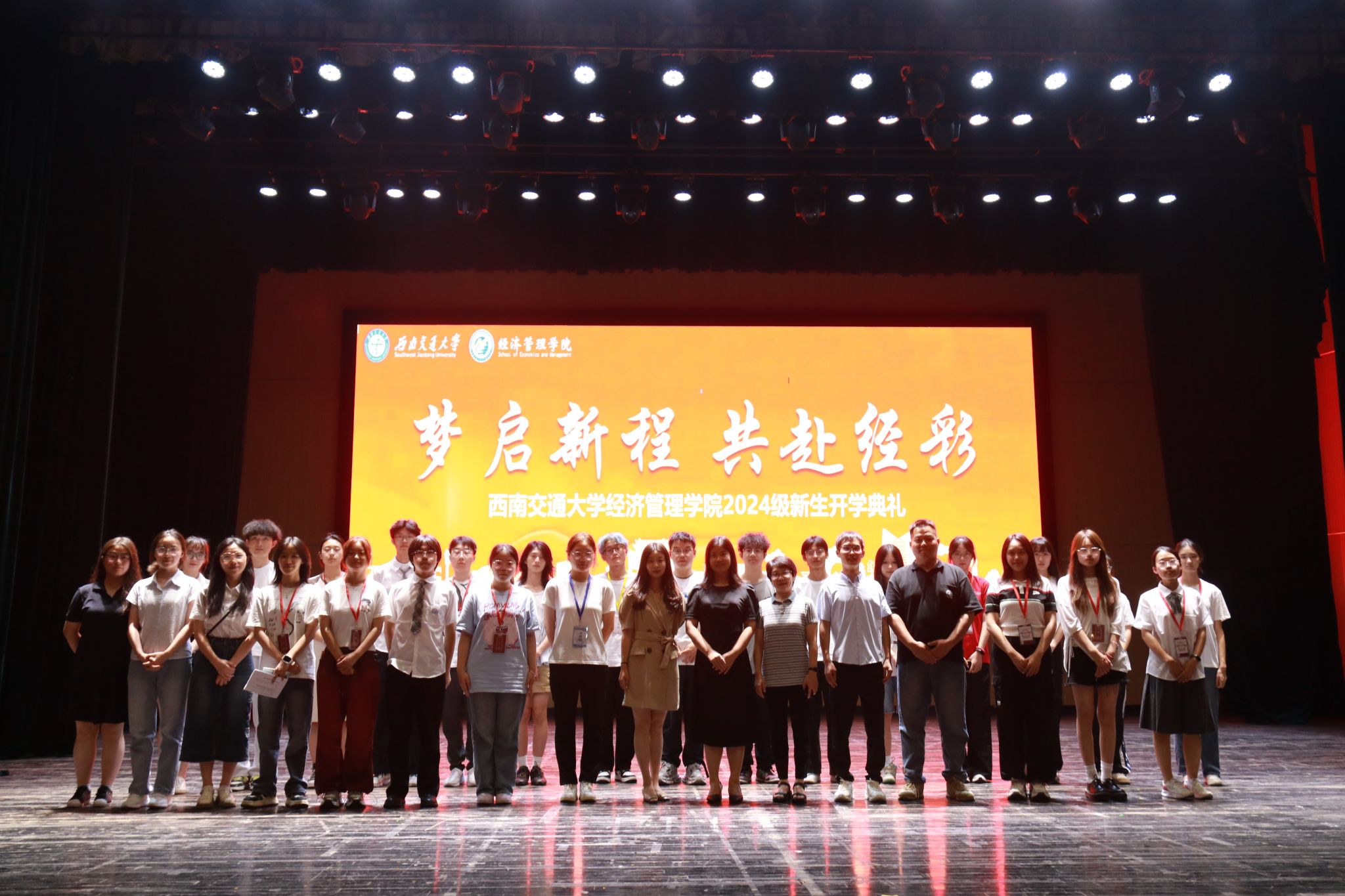 2024年8月31日晚,西南交通大学经济管理学院2024级新生开学典礼在学生大会堂隆重举行。出席本次开学典礼的领导和嘉宾有:学院党委书记郭强,院长韩科,学院党委副书记、纪委书记晏理斌,副院长李良、聂佳佳、马锋,以及学院各系、中心的教职工代表,各班班主任,2024级辅导员。活动由学院党委副书记余小英主持。