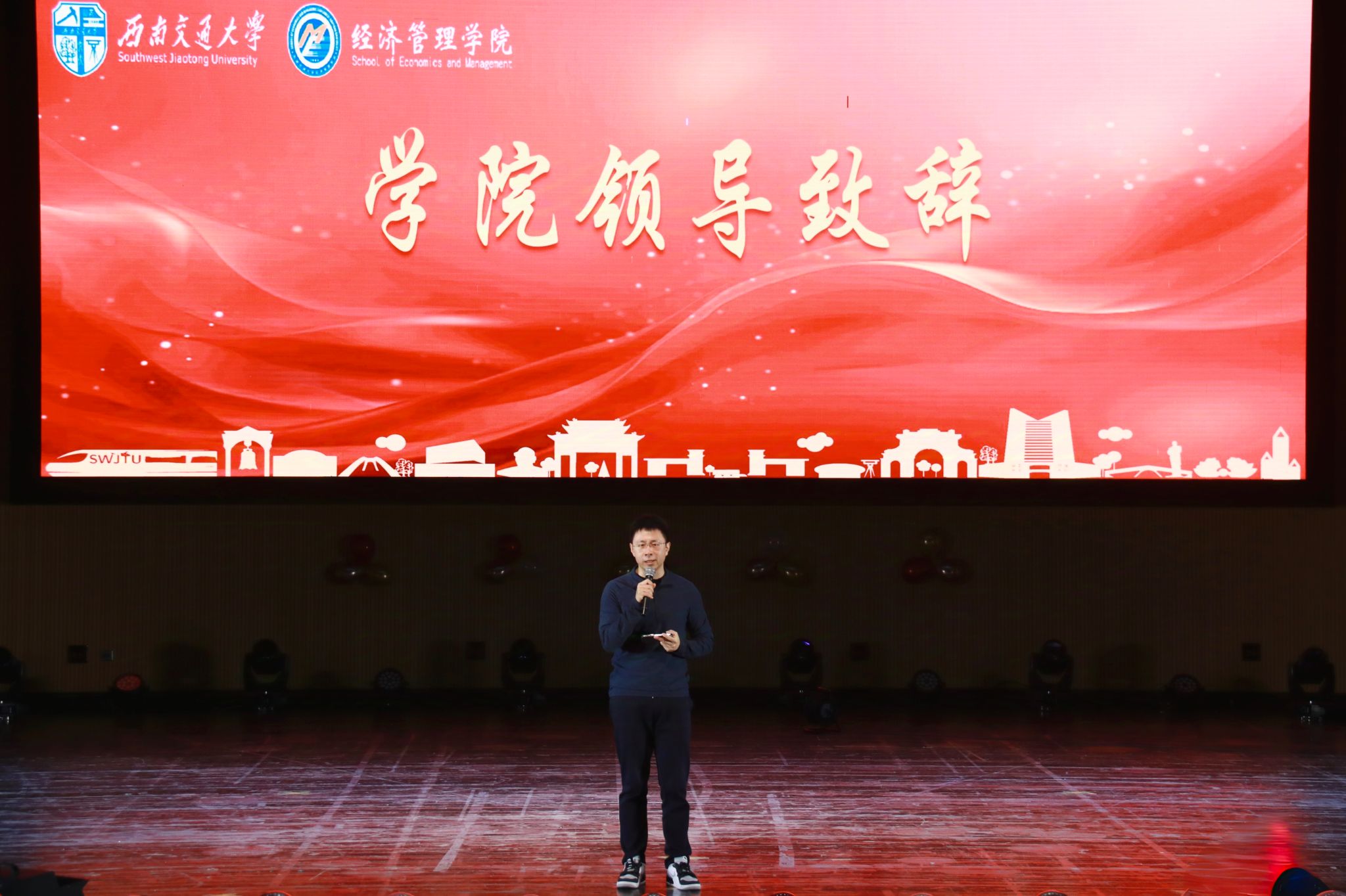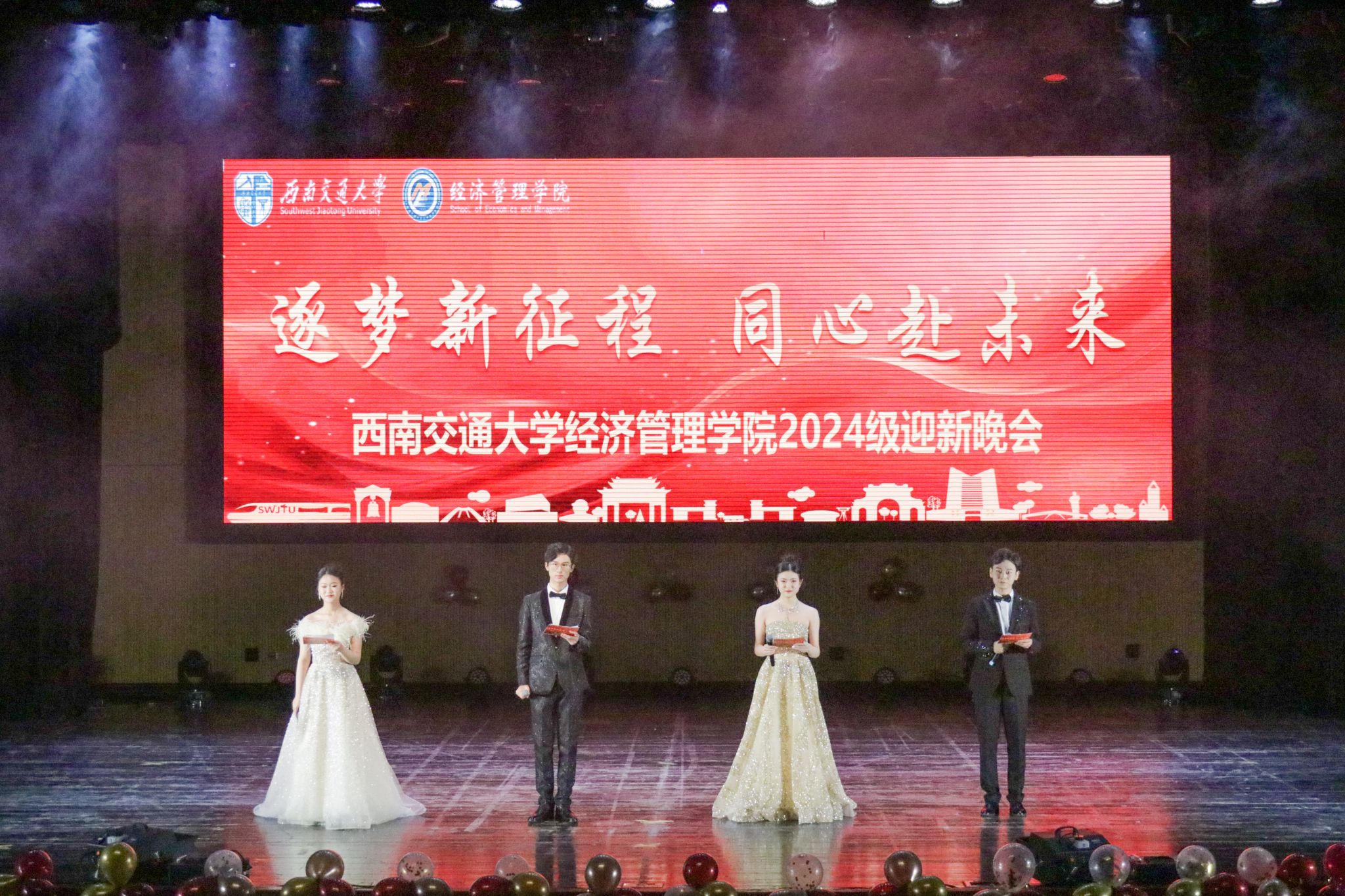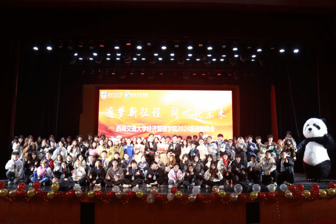 为热烈欢迎2024级经管新学子,迎接2025年的到来,2024年11月30日,西南交通大学经济管理学院在九里校区大学生会堂举办“逐梦新征程 同心赴未来”2024级迎新晚会。经济管理学院院长韩科,党委副书记余小英,副院长李良、聂佳佳,团委书记贾佳,本科2024级各班班主任老师,学生工作组全体辅导员,电子科技大学经济与管理学院、西南财经大学会计学院学生会主席以及各兄弟学院学生会嘉宾出席晚会。