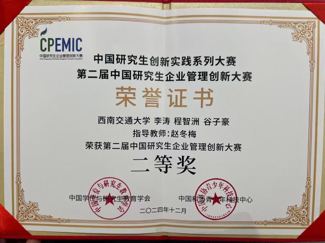 本次赛事共吸引了全国298所高校,14433名研究生参赛。西南交通大学经济管理学院的两支参赛队伍——“蜀道山”队(队长:罗蔚瑶,队员:代玉龙、熊海微、曾沁、邓鸽;指导老师:李从容、宋竞)与“别和我作队”(队长:李涛,队员:谷子豪、程智洲;指导老师:赵冬梅),凭借出色的策略与执行力,历经初赛、复赛和决赛,分别从“商业分析与智能应用”赛道的1600支队伍和“企业决策”赛道的2491支队伍中脱颖而出,荣获全国一等奖和二等奖,为校争光。