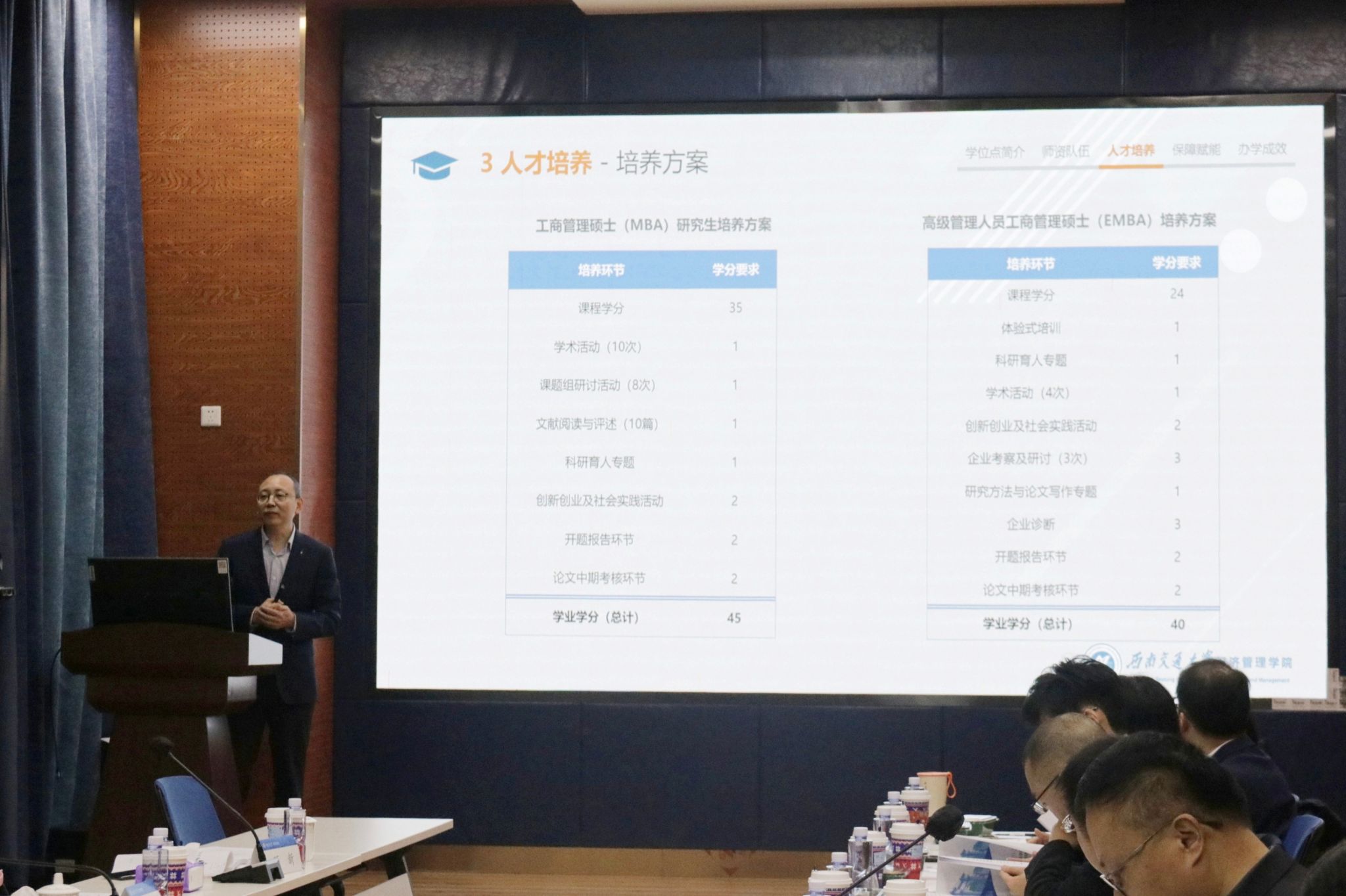 经济管理学院副院长李良汇报了工商管理专业硕士学位点的师资力量、教学资源、科研水平、人才培养等多方面的情况。专家组通过听取汇报、审阅材料、现场提问等方式,对学位点的建设情况进行全面评估。