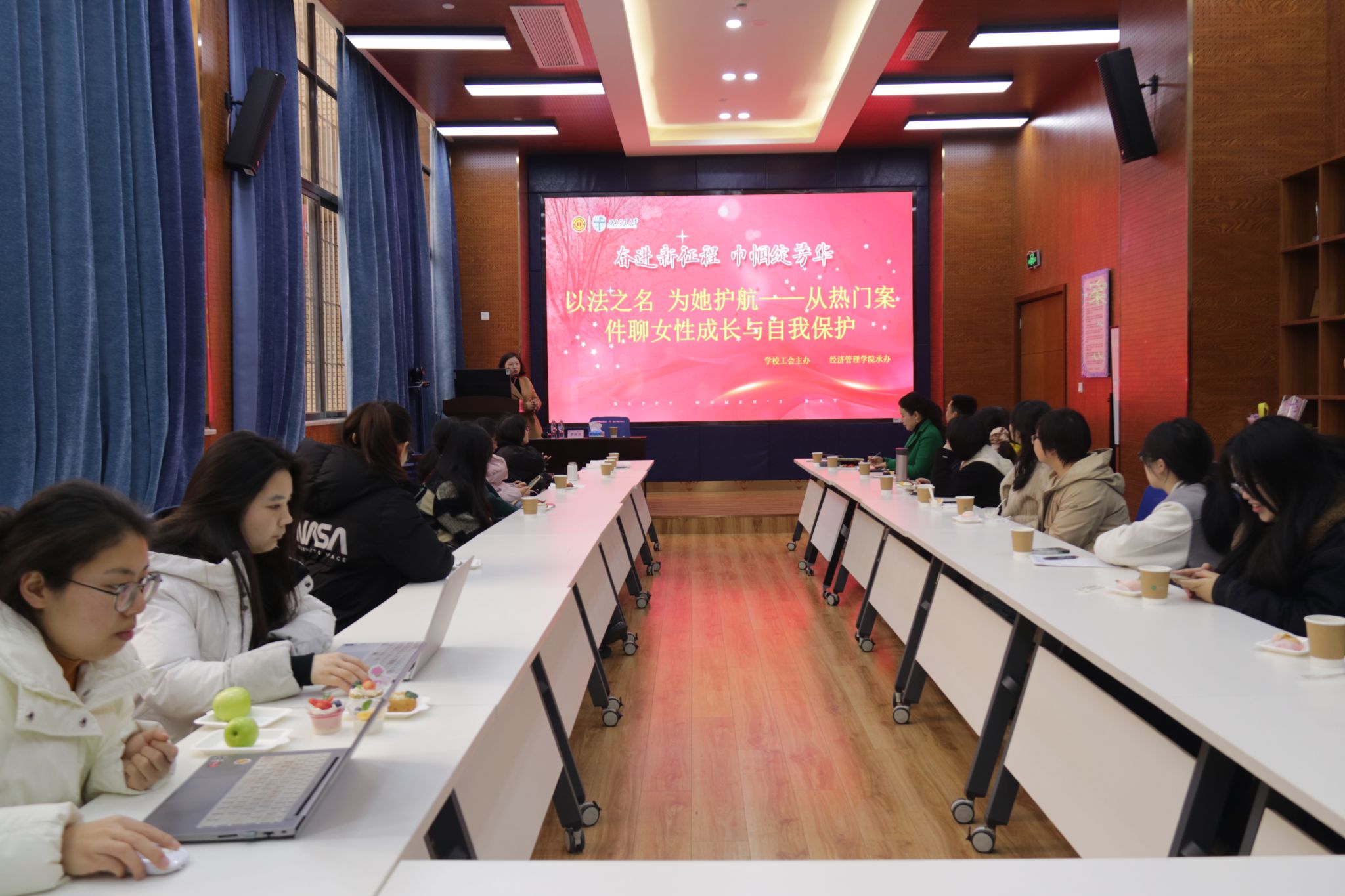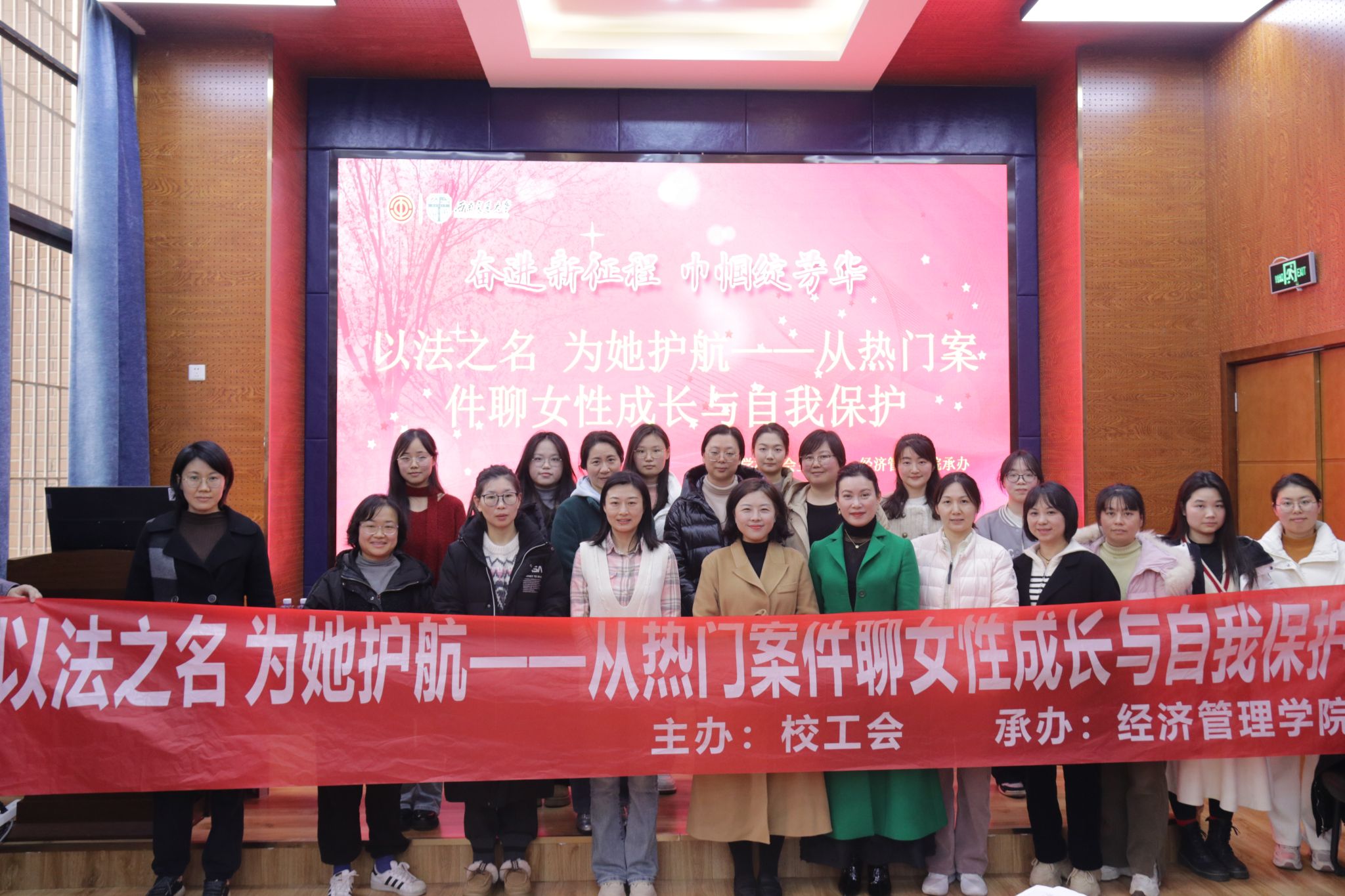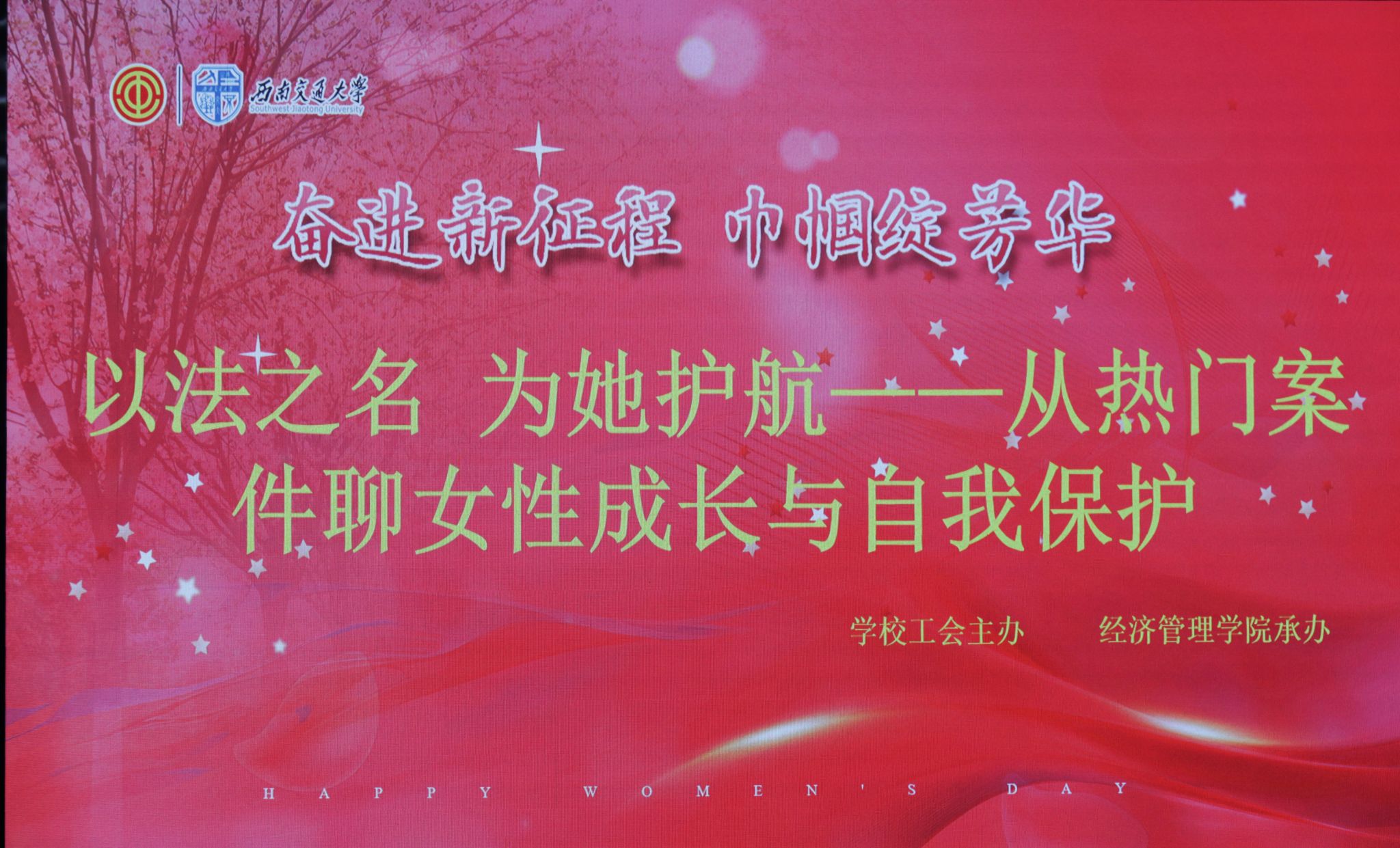 阳春三月,正值第115个国际妇女节来临之日,为提高高校女性教工的法律素养,增强法治观念,促进女性教工群体的法律自我保护意识和能力,2025年3月7日下午2点30分在九里校区0218教室开展了一场“以法之名 为她护航-从热门案件聊女性成长与自我保护”专题分享活动,活动邀请了四川省十佳公诉人、优秀律师蔡蕤洁作主题分享。活动由西南交通大学工会主办,经济管理学院工会承办。