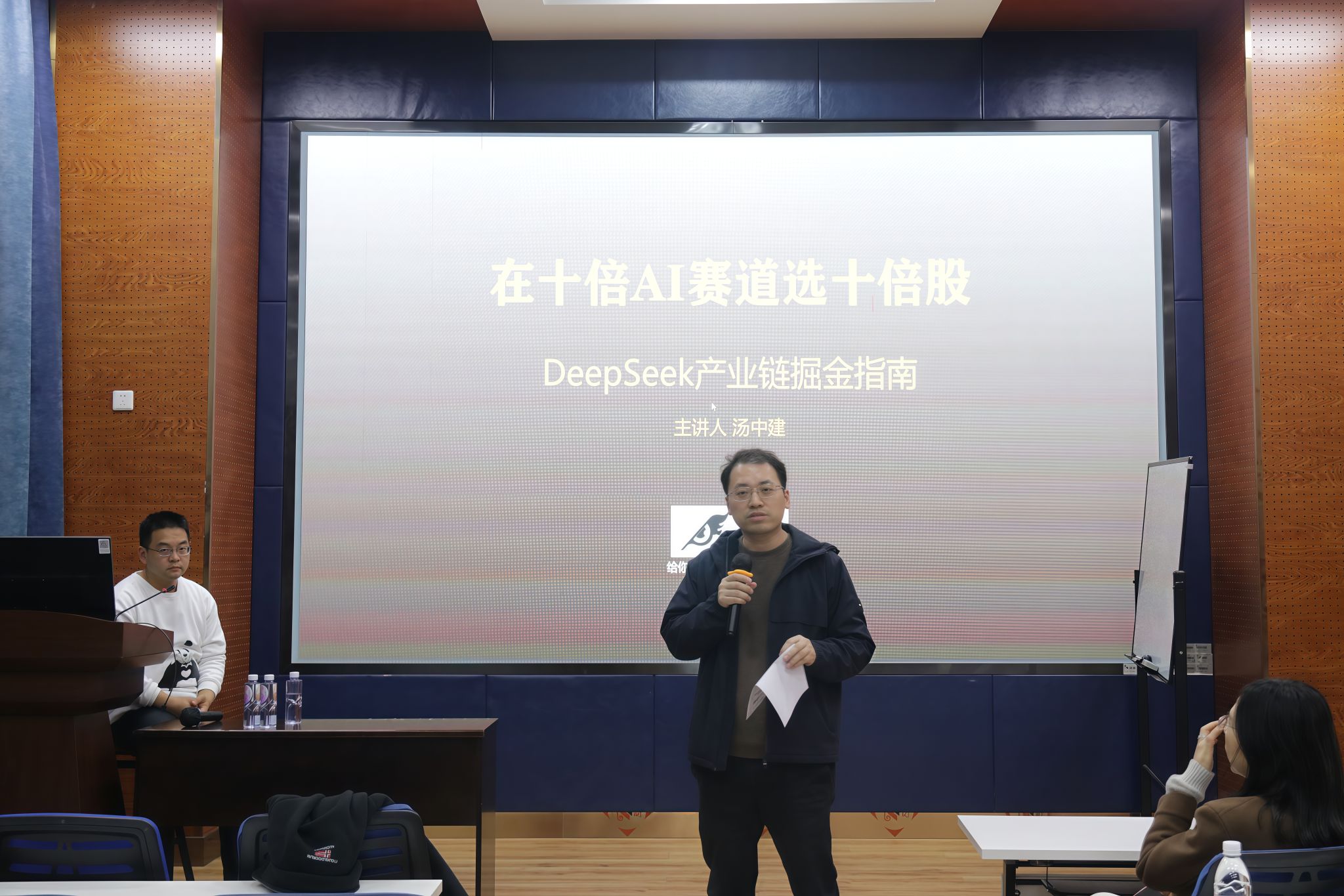 2025年3月15日晚7点,火眼财睛董事长汤中建应邀在西南交通大学经济管理学院开展了题为“在十倍AI赛道选十倍股”的讲座。本次讲座以DeepSeek为代表的人工智能产业崛起为切入点,旨在通过剖析AI前沿技术应用以及相关产业链,为学生投资实践与未来职业发展提供帮助。本次讲座由学院专业学位教育中心副主任诸波主持。