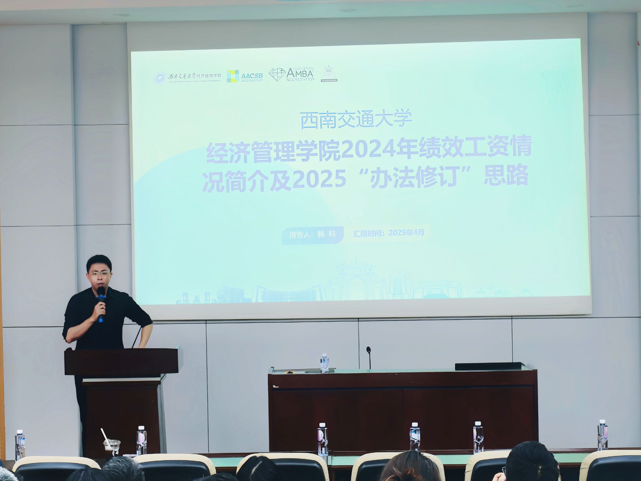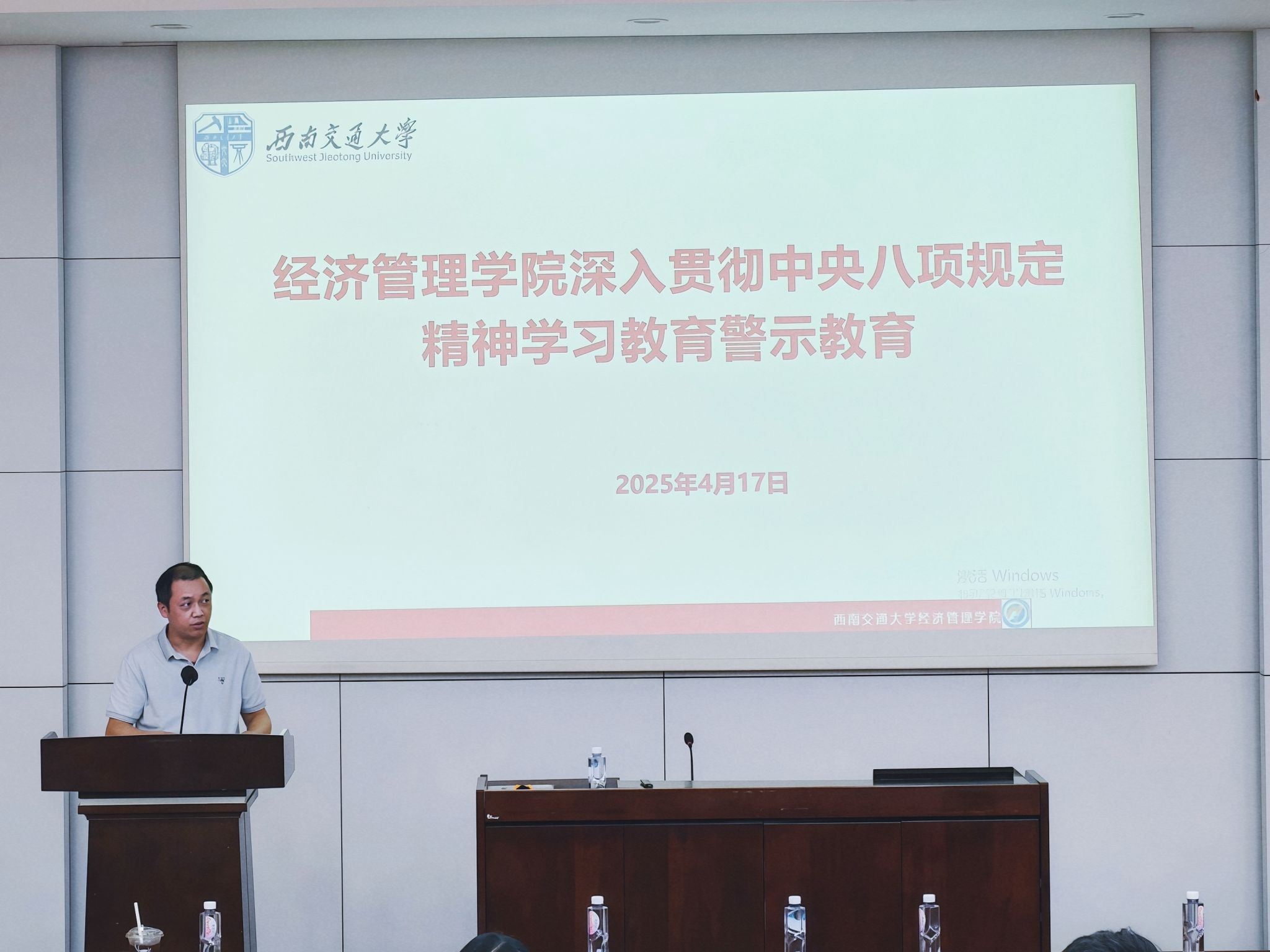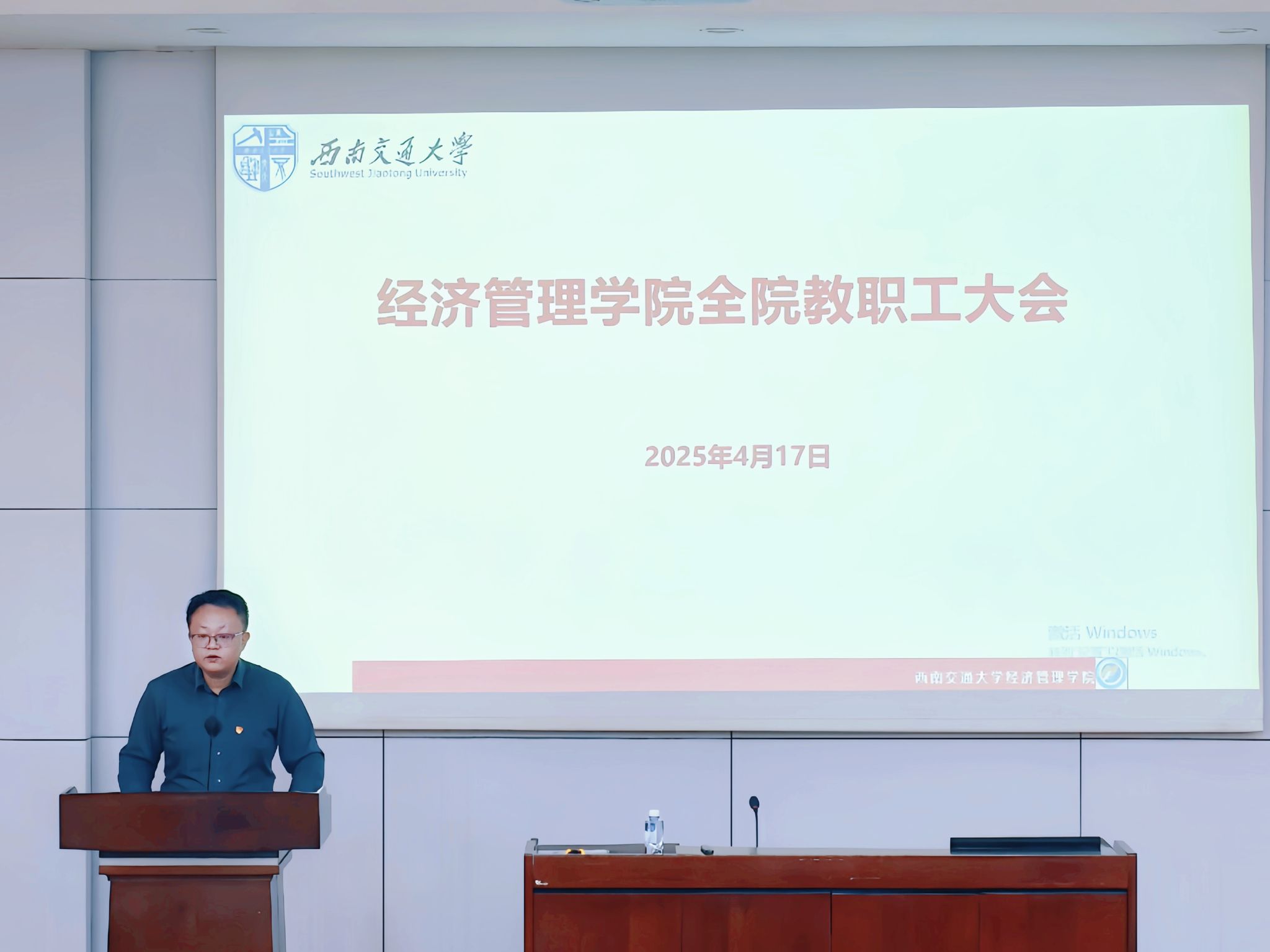 2025年4月17日下午,西南交通大学经济管理学院于九里校区0215室召开全院教职工大会,会议围绕“深入贯彻中央八项规定精神学习教育警示教育”和“学院绩效办法调整”两项议题展开。会议由学院党委书记郭强主持,学院领导班子及全体教职工参加会议。