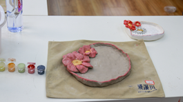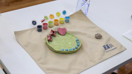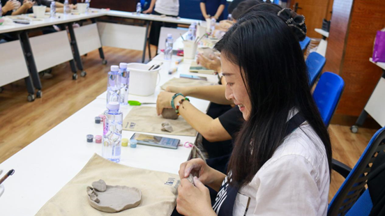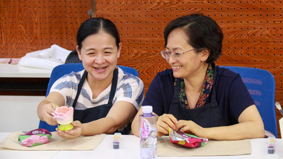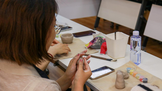 在专业人员的指导下,老师们纷纷化身“手作达人”,开始制作独属自己的陶瓷工艺品。拿出泥土,在桌上重重拍打,反复用手按压,老师们全神贯注地投入到制作流程中,在手工乐趣中释放教学研究与行政管理工作中的压力。作品初具雏形之后,老师们拿起画笔与颜料开始在泥土上描摹,将情思注入灰色的泥土中,赋予其活泼天真的生命力。