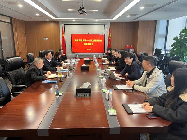 为深化校企合作,促进产学研融通创新,探索学院发展、人才培养、校企合作新路径,2025年11月19日下午,经济管理学院党委副书记、纪委书记余小英、副院长马锋一行前往四川发展证券投资基金管理有限公司(以下简称“川发证券基金”)开展调研交流。专业学位教育中心、金融与财务学系、学生工作组、教师服务办公室相关老师参加本次交流座谈活动。