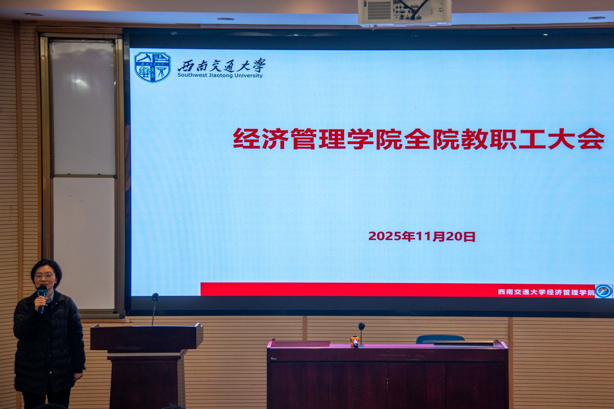 2025年11月20日下午,经济管理学院在九里校区0202室召开全院教职工大会,会议由学院党委书记蒋佳主持。