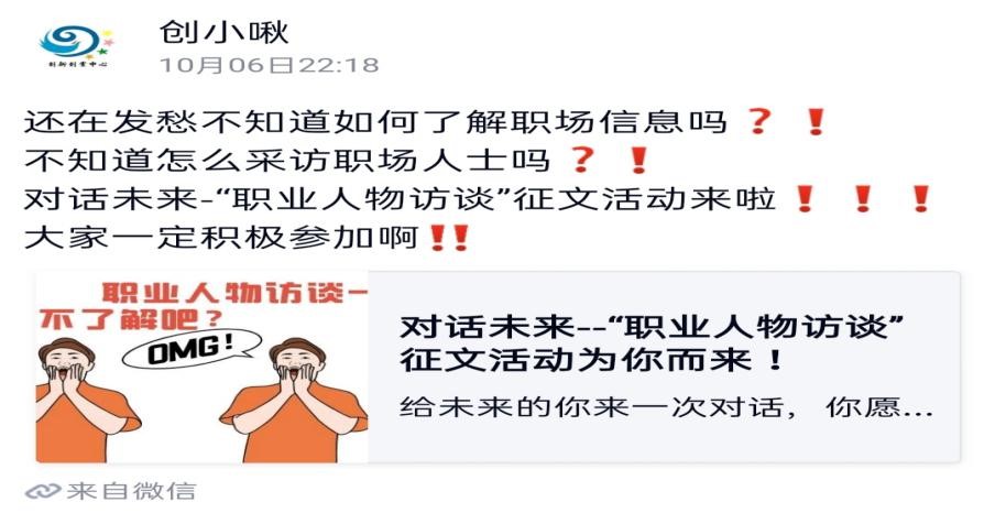 10月15日至10月20日,经济管理学院创新创业中心举办了“对话未来”-职业人物访谈征文活动。职业人物访谈,是通过与一定数量的职场人士会谈而获取关于一个行业、职业和单位“内部”信息的一种职业探索活动,是大学生职业选择和职业定向的一个自助平台,是在校大学生了解和认识社会需求、职业需求、职业环境和基本状况的有效方式。这些信息能够帮助在校大学生正确认识自己的优势和不足,从而制定合理的职业生涯规划。