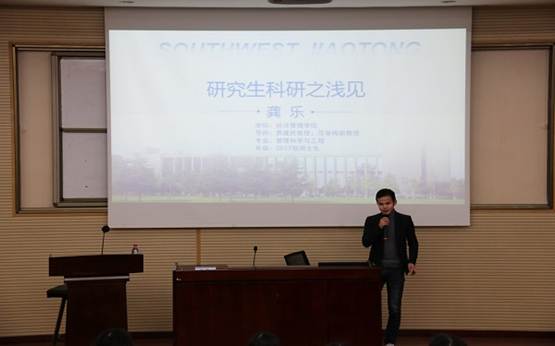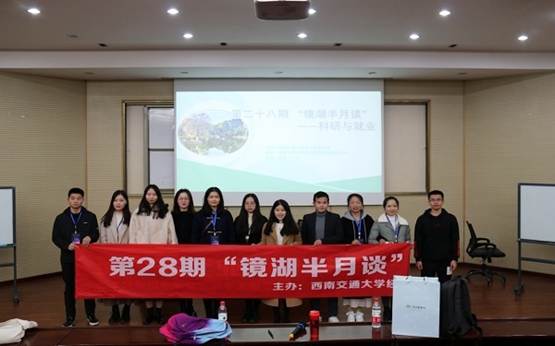 2019年11月28日下午2点,由西南交通大学经济管理学院主办的第二十八期“镜湖半月谈”活动在九里校区信息楼0202教室展开。本次镜湖半月谈的主题为科研与就业,辅导员戎尚老师出席本次活动,由2017级优秀学生代表龚乐和熊璐洁担任主讲嘉宾,经济管理学院全体2019级硕士研究生参加了本次活动。