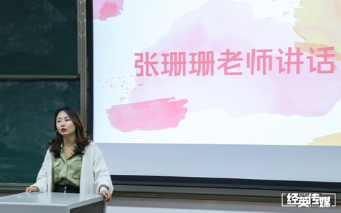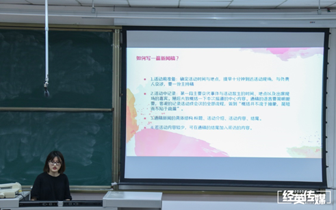 随后,由经英传媒中心采编部赵哲为同学们讲解如何写一篇规范的新闻稿。她的讲解主要分为三个部分:什么是新闻稿、如何写一篇新闻稿、如何使一篇稿件更规范。在介绍如何使一篇新闻稿更规范时,她分别从新闻写作内容、写作格式、写作注意事项为同学们带来讲解,并为同学们解释了如何在经济管理学院院网挂稿。