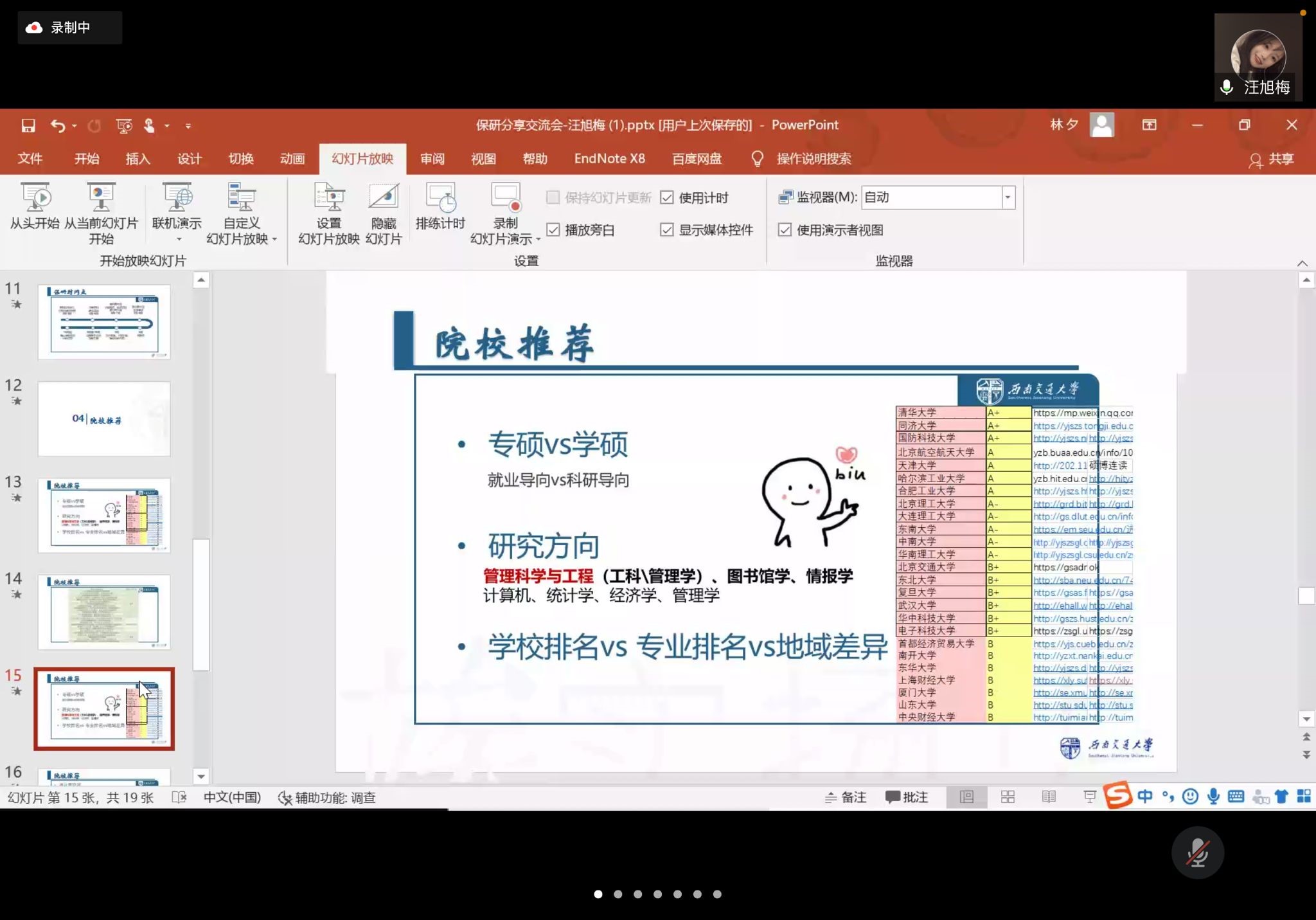 2月20日下午14点整,为加强学校学风建设,帮助学生了解保研流程,由经济管理学院创新创业中心举办的保研讲座在腾讯会议拉开帷幕。本次讲座全程采用主讲人线上分享的形式,共有115名同学参与其中,整个过程历时约一个半小时。讲座伊始,六名交大优秀的保研学子分别从个人经历、保研材料准备、保研学校选择以及面试注意事项等方面全方位、多层次地对相关问题进行了讲解。