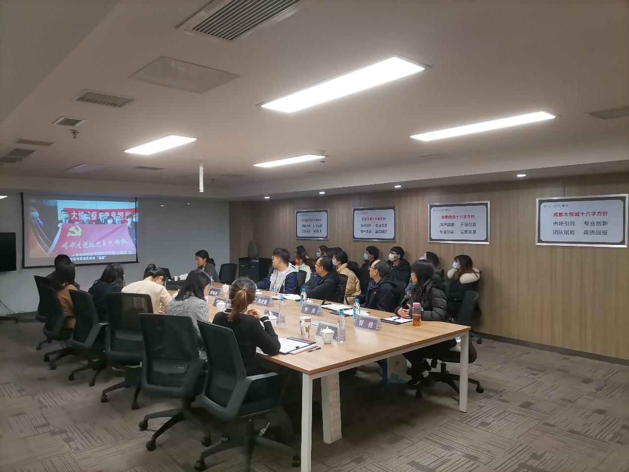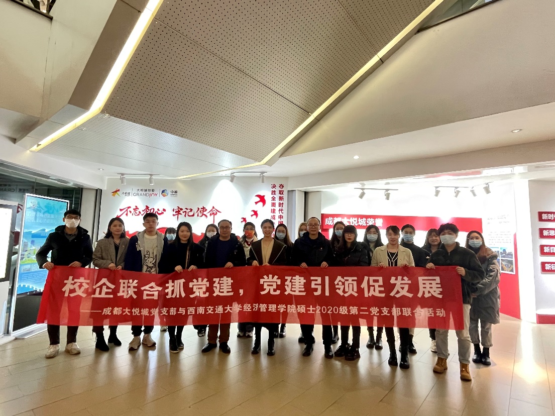 为学习贯彻党的十九届六中全会精神,全面开展党建活动,加强思想政治建设与实践。2021年12月15日下午,西南交通大学经理管理学院硕士2020级第二党支部在党委副书记杨宏毅、副院长李良以及支部书记贾佳老师和研究生辅导员陈海波老师的带领下,至成都大悦城公司开展“校企联合抓党建,党建引领促发展”主题活动。