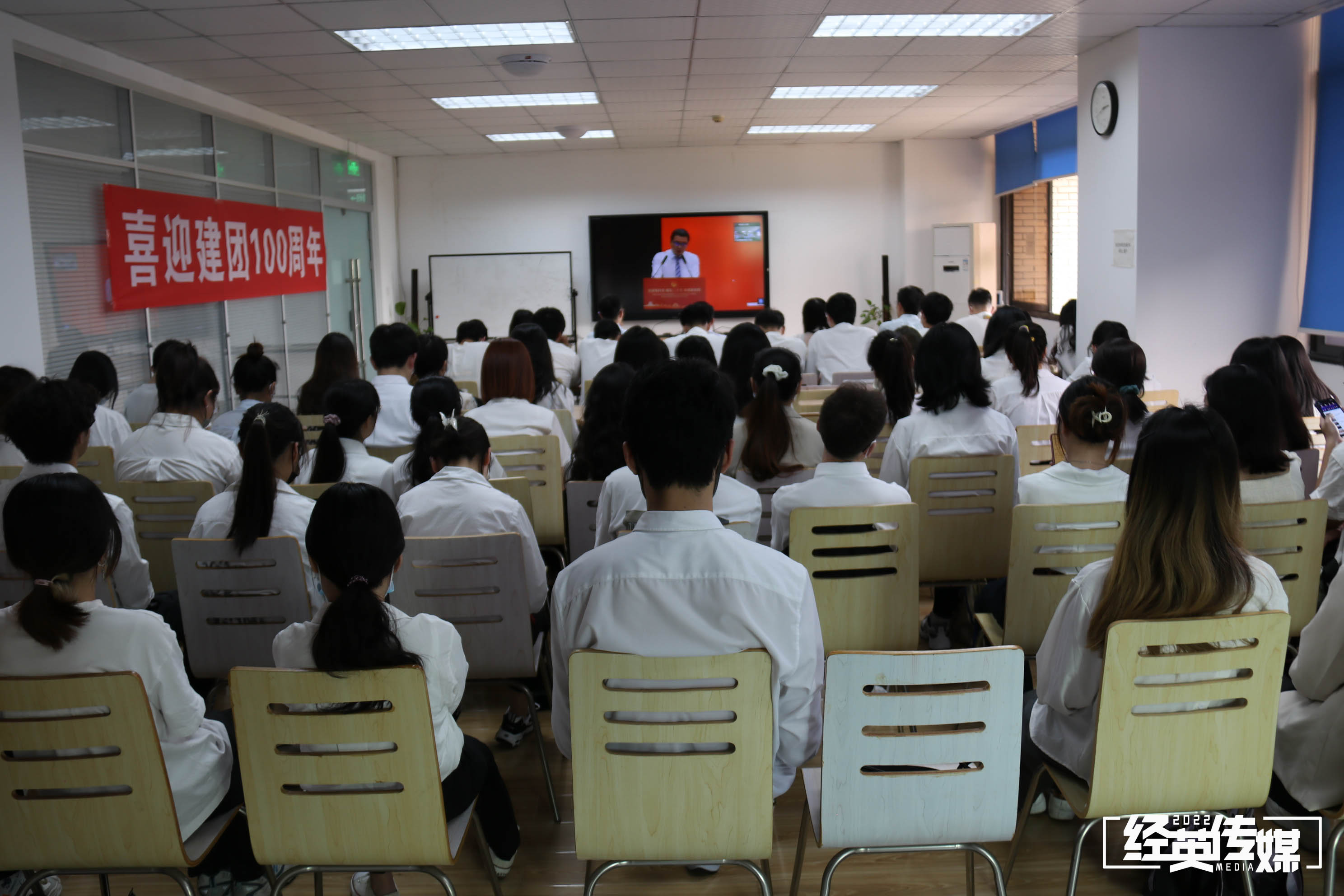 4月29日下午,西南交通大学经济管理学院师生于经济管理学院分会场就坐,线上观看西南交通大学庆祝中国共产主义青年团成立100周年暨2022年共青团工作表彰大会。本次表彰大会经济管理学院分会场参会嘉宾有学院党委副书记杨宏毅、团委书记贾佳、团委副书记苏扬、辅导员张先凌、陈海波、任永昌。
