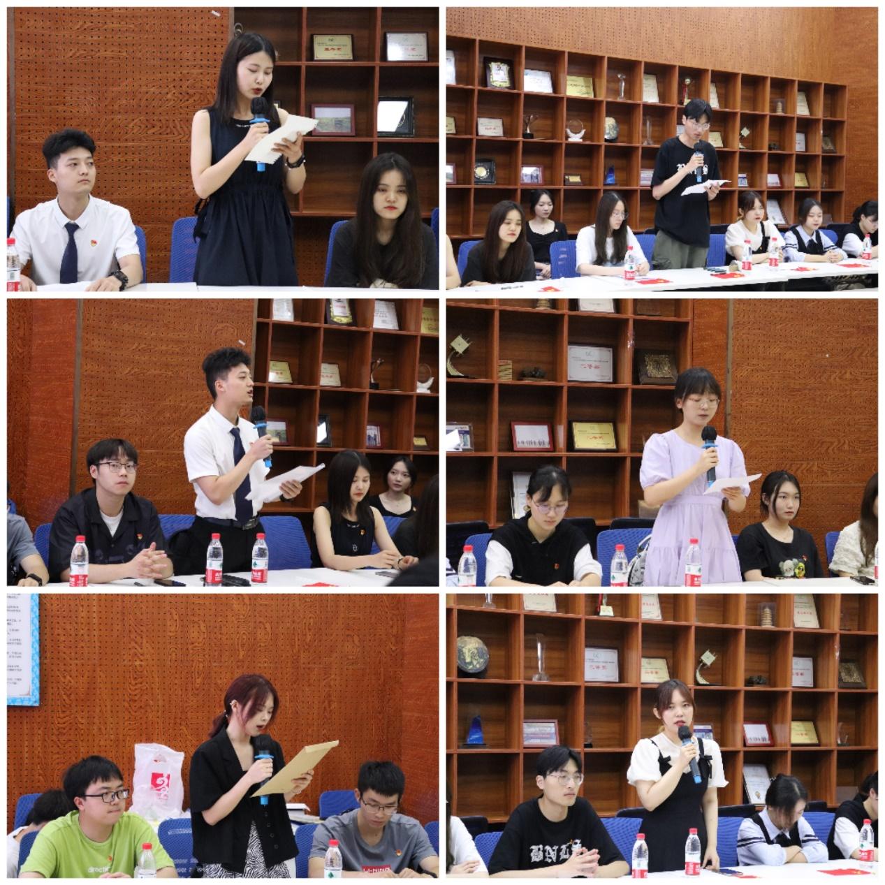 张鑫诺、张思成、秦庭炜、陆菲、潘阿敏和尹玉萌六位毕业生党员围绕回忆入党历程、感谢组织培养、祝福全体毕业生党员同志等方面发表了自己的毕业感言。张鑫诺同志回顾了自己的入党历程,表达了对党支部培养的感谢,并祝福每一位毕业生党员要带着经济管理学院的回忆在更加广阔的天地追求理想。张思成同志表示,作为本科经贸类党支部的青年委员,很荣幸见证了党支部的成长和发展,感谢学院党委和党支部对全体党员的教育培养,相信在学院党委的带领下,党支部会越来越好。秦庭炜同志围绕感激二字,表达了对学院、党支部、老师和一起走过入党历程的同学的感激,表示唯有努力才能不辜负胸前的党员徽章。陆菲同志表达了对党支部的感谢,将来依然会用党员的身份来严格要求自己,努力学习、踏实工作,不辜负母校的培养,做社会的栋梁。潘阿敏同志认为本科2018级是幸运的一届,在疫情时代拥有相对完整真实的大学生活,培养了更多的责任感,在今后定会继续扎实工作,不辜负交大四年的培养,为母校争光。尹玉萌同志真诚地表述了自己内心的想法,回忆自己与党支部和同学们共同经历的点点滴滴,她特别提到了党课老师曾经讲过的一句话“为有牺牲多壮志,敢教日月换新天”,她将会牢记这句话,在以后的生活里会更加努力奋斗。