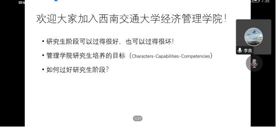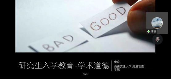 学术道德规范是研究生入学后需要学习的第一课,也是非常重要的一课。2022年9月22日晚19:30,经济管理学院学工组组织开展线上学术道德讲座,此次讲座邀请经济管理学院副院长李良担任主讲嘉宾,全体硕博新生参与其中。