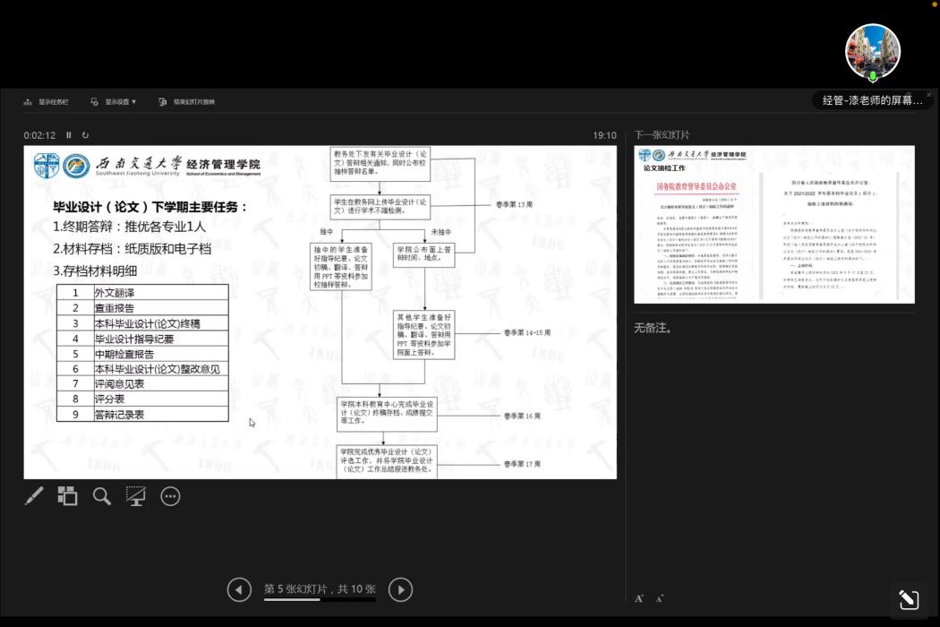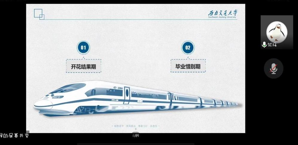 在日常与年级相关的内容讲解环节,2019级辅导员苏扬老师将2019级同学的大四生活描述为“开花结果期”与“毕业惜别期”。他对前面老师讲的主要内容进行了强调与总结,并将讲解的重点放在同学们的学习生活当中,结合问卷调查中同学们的毕业意向给出相应建议,并从疫情防护、考研备考、心理健康等方面给大家进行指导,也向全体同学表达了对未来的祝福。
