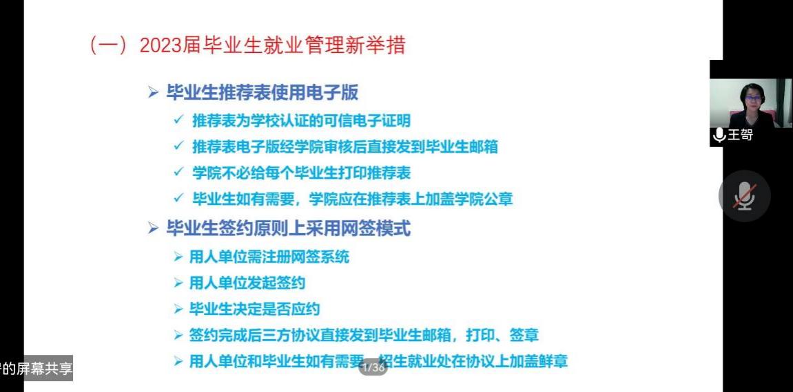 在就业与签约相关的内容讲解环节,2019级辅导员王哿老师具体从2023届毕业生就业形势、学院近年毕业生就业情况、就业管理说明、就业网签约指南、就业处联系方式等五个方面进行讲解。在讲解中,王老师用多个表格及图像直观的向同学们展示了考研、就业等的现状。对于就业管理这一版块,她将所有时间点与注意事项详细地与大家分析,同时也对同学们提出的问题进行了答疑,并在最后为同学们送上求职成功的祝福。