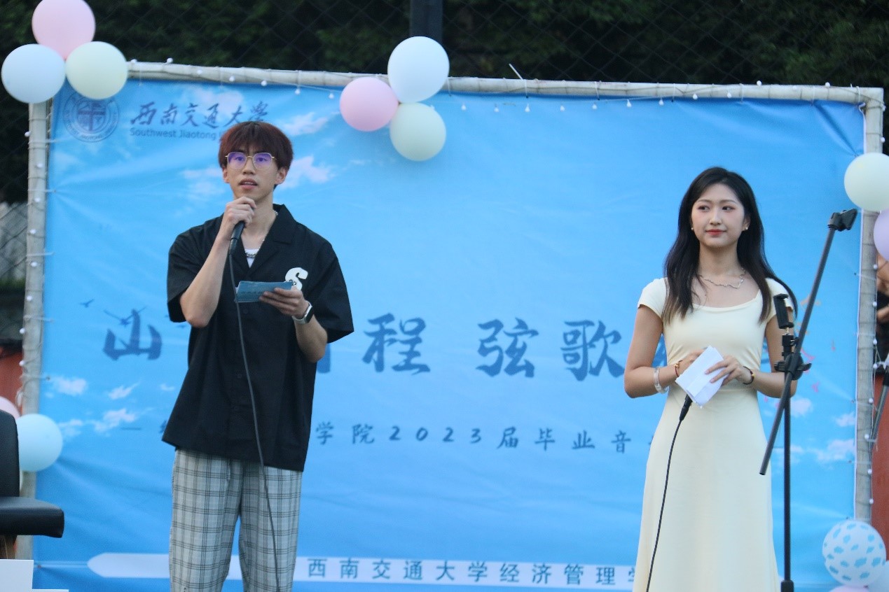 在毕业临近之际,为给经济管理学院2023届毕业生留下一个美好的校园回忆,2023年6月8日晚在九里校区足球场,我院成功举办以“山水万程,弦歌相伴”为主题的2023届毕业音乐晚会。本次晚会邀请了经济管理学院党委副书记杨宏毅老师,本科2021级辅导员张先凌、莫代玉老师,本科2020级辅导员陈建奇老师,本科2019级辅导员苏扬、安静泽老师,经济管理学院各年级同学参与本次晚会。本次毕业音乐晚会由我院学子和老师以独唱和合唱的方式共同演绎了23首歌曲。