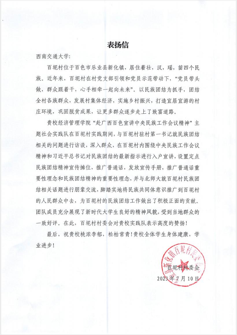 在四天的实践活动中,实践队遇上了同样前来学习调研的社会实践团队,遇上了当地热情淳朴的各民族同胞,遇上了深夜加班为群众解决问题的基层干部。实践结束后,百坭村村委充分认可了本次主题实践活动并向西南交通大学发来表扬信。