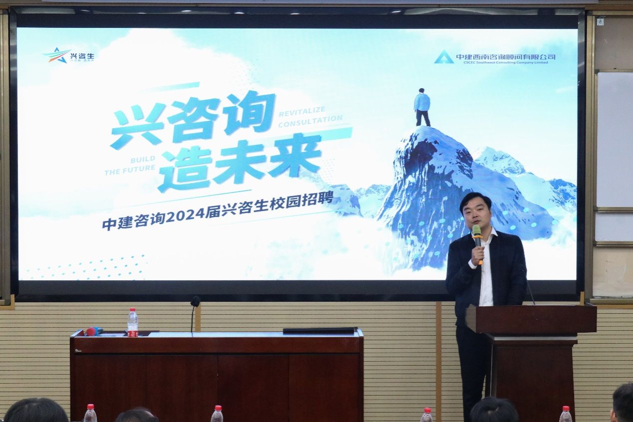按照学校“访企拓岗促就业”专项行动要求,积极推进经济管理学院2024届毕业生就业工作,2023年10月9日,中建西南咨询顾问有限公司在西南交通大学九里校区0204教室开展校园招聘会。出席本次会议的嘉宾有中建咨询党委副书记乐志翔、中建咨询人力资源部总经理景权仪、中建咨询第六事业部总经理陈枭、中建咨询人力主管黄志刚;西南交通大学经济管理学院党委副书记杨宏毅、国内合作与校友事务中心主任赵冬梅。本次大会由经济管理学院国内合作与校友事务中心副主任张笑芸主持。