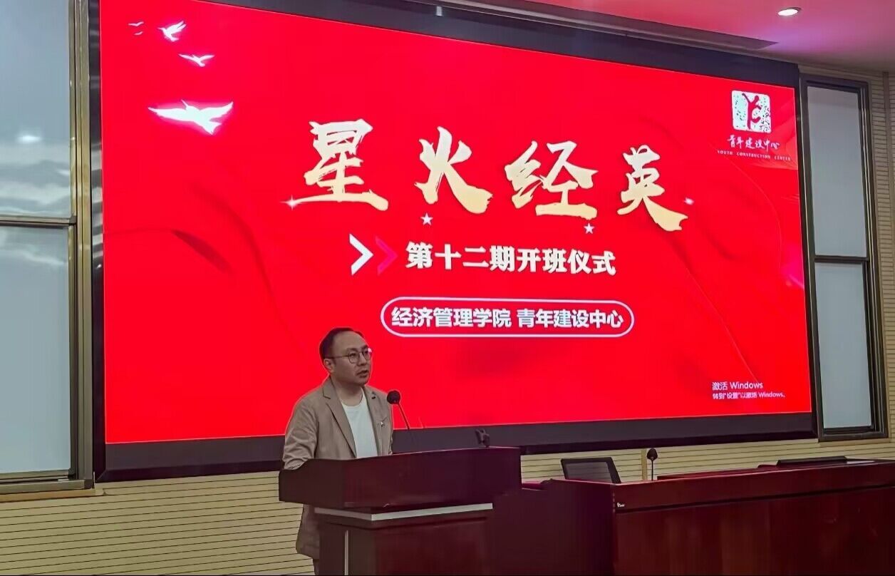 2023年10月12日晚,经济管理学院开展了“星火经英”计划第十二期开班仪式暨第一次团干部培训。经济管理学院党委副书记、学生工作组组长杨宏毅,分团委书记、研究生辅导员贾佳,数学学院团委书记邓思然,分团委副书记、本科2023级辅导员、学生会指导老师苏扬,本科2021级辅导员、班级联合会指导老师张先凌,本科2021级辅导员、青年建设中心指导老师钟文婷,本科2022级辅导员王子琦出席本次活动。