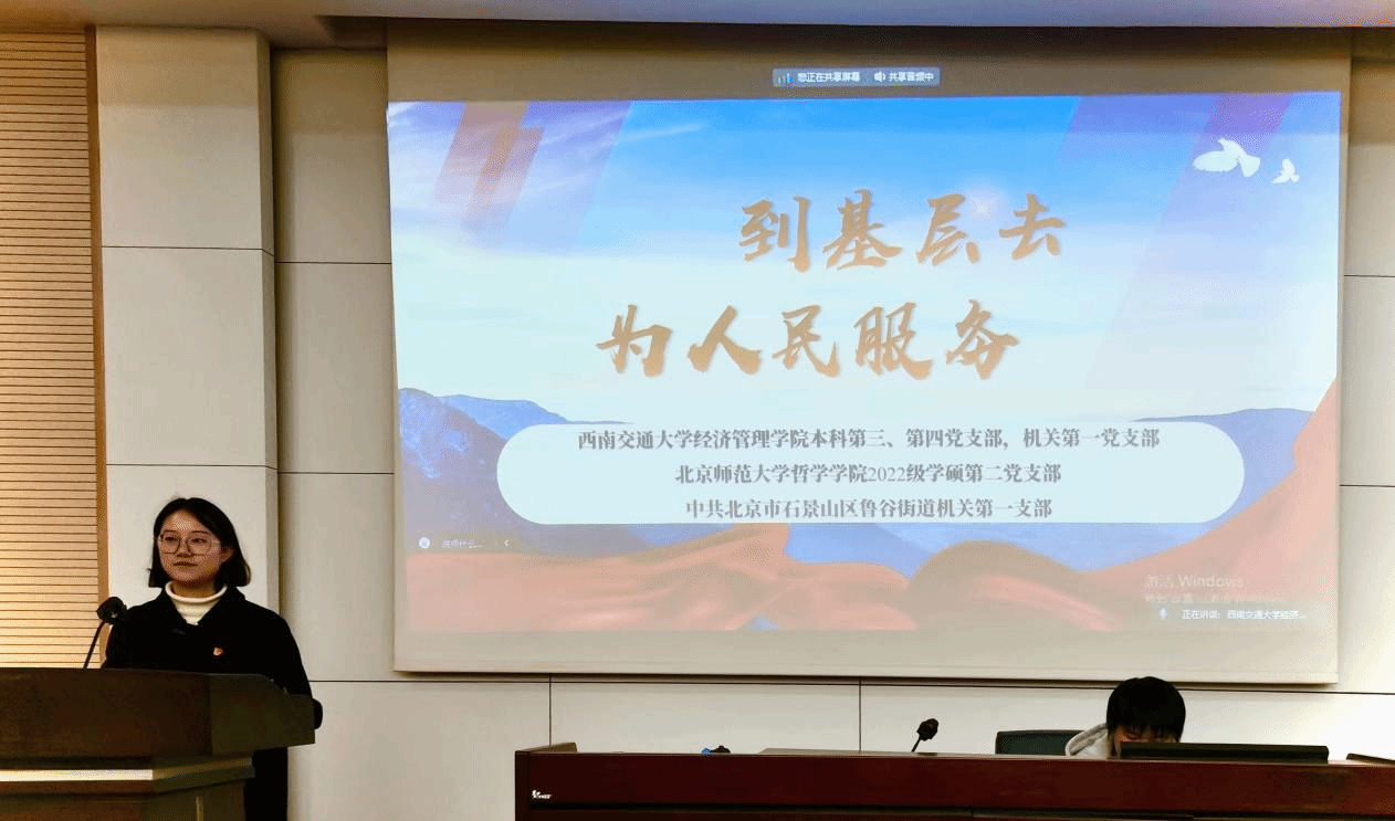 全心全意为人民服务是中国共产党的根本宗旨,而深入基层则是实现为人民服务的重要途径。为提高支部成员思想认识,明确基层工作的重要意义,鼓励支部青年积极投身于中国式现代化建设、以蓬勃风貌建功新时代,2023年11月16日下午,经济管理学院本科第三、第四党支部、机关第一党支部、北京师范大学哲学学院2022级学硕第二党支部、北京市石景山区鲁谷街道机关第一党支部以线上线下相结合的方式开展“到基层去,为人民服务”主题党日活动,本科第三党支部书记苏扬,本科第四党支部书记张先凌,机关第一党支部书记何鹏,以及各支部部分成员于J0215线下参会。