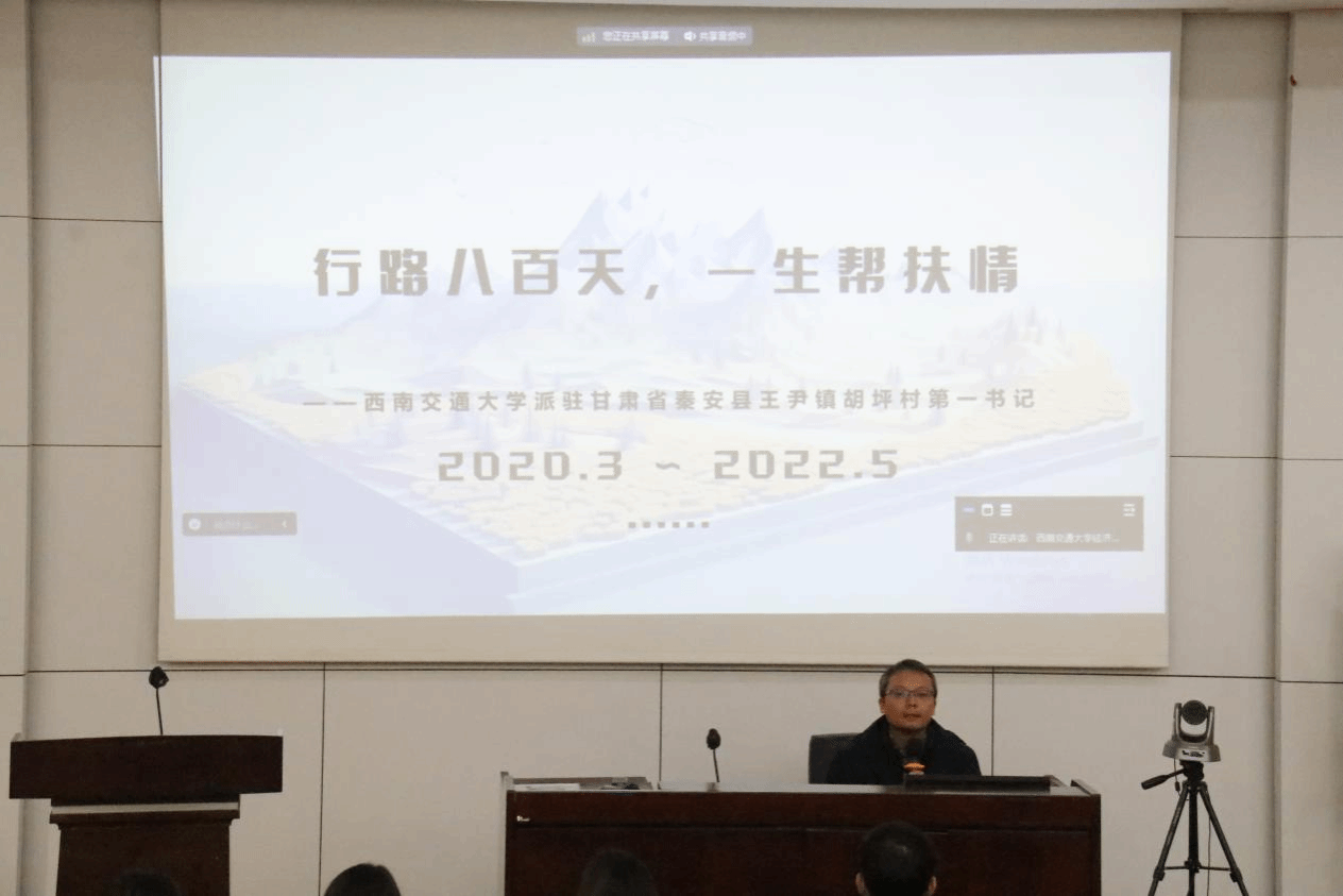 助力扶贫事业,兜底群众难事。经济管理学院机关第一党支部书记何鹏老师带来了他在甘肃省秦安县的两年驻村帮扶经历分享。行路八百天,一生帮扶情。2020年,何鹏老师带着助力脱贫攻坚收官之战的重担赴陇上任。因饮食习惯差异带来的不适、与成都截然不同的气候、自己一窍不通的西北方言都给何老师的工作带来了不小的挑战,在两年的时间里,何老师不断攻克难关,深深扎根基层,走访调研全村居民,扎实推动党建、脱贫攻坚、巩固拓展脱贫攻坚成果同乡村振兴有效衔接、人居环境整治、疫情防控等地方重点工作,并完善乡村产业链,改善基础设施建设,开展基础教育帮扶,通过多方资源引入了帮扶资金项目数百万元。何老师向同学们分享了他对于基层工作的认识与感悟,也鼓舞同志们树立长远目标,到基层的大舞台施展才干。