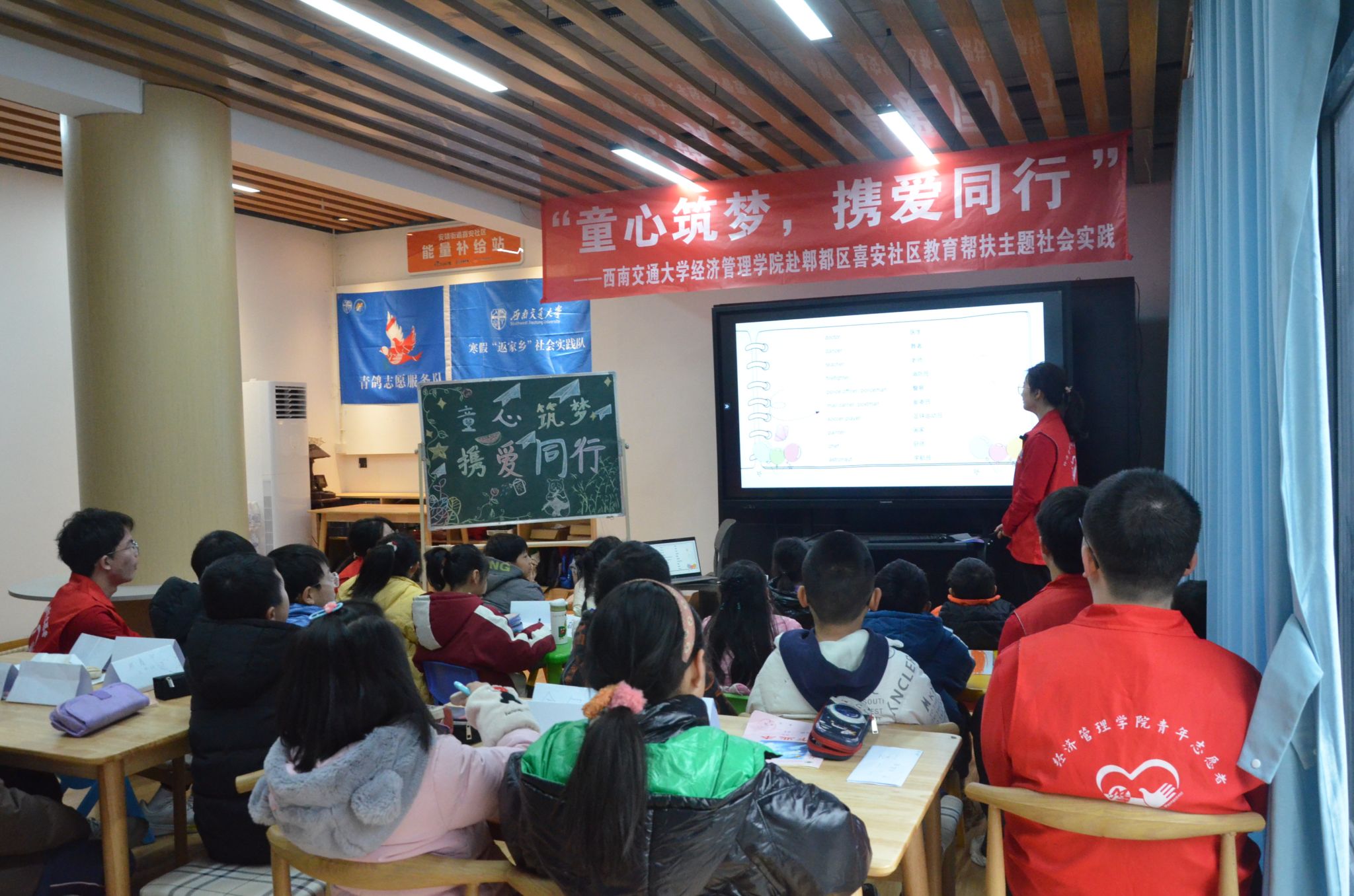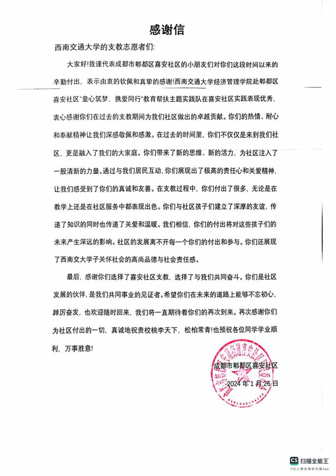 2024年1月20日,西南交通大学经济管理学院青鸽志愿服务队联合郫都区喜安社区居委会开展了为期6天的“童心筑梦,携爱同行”教育帮扶寒假“返家乡”社会实践活动。为激发辖区孩子的学习兴趣、培养孩子们的保护环境意识,志愿者们准备了丰富的文化教学课程,还为辖区孩子准备了有趣的野生动物科普课和文化宣传课。志愿者们为小朋友带来书法的故事,孩子们认真观看,在志愿者的指导下学写毛笔字。最后一天,志愿者们还开展了新年送祝福的活动。活动结束后,队伍收到了来自成都市郫都区喜安社区的感谢信。