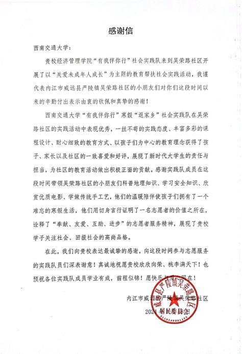 2024年1月15至17日,西南交通大学经济管理学院“有我伴你行”实践队以“扶智又扶志,青春新献礼”关爱未成年人教育帮扶为主题,走进四川省内江市威远县严陵镇,联合新时代文明实践所开展丰富多彩的主题实践活动。实践队员们为孩子们带来了丰富有趣的课程:地理小课堂、“心灵奇旅”电影欣赏课、“平安守护”安全科普课、“布艺工坊”织布手工课等,在拓展知识面的基础上,引导孩子们将所学所感与实际生活相结合。实践队还设计了关于传统文化的创新课程:“欢乐绘春节”绘画课,在培养同学们艺术爱好的同时,也扩展了他们的传统文化知识视野,培养了他们的民族认同感。在“剪影行云”剪纸课中,实践队员带着孩子们认识剪纸的主要形式和意义,在感受新春佳节氛围的同时,也不断学习中华民族传统文化。活动结束后,实践团队收到了来自吴荣路社区的感谢信。