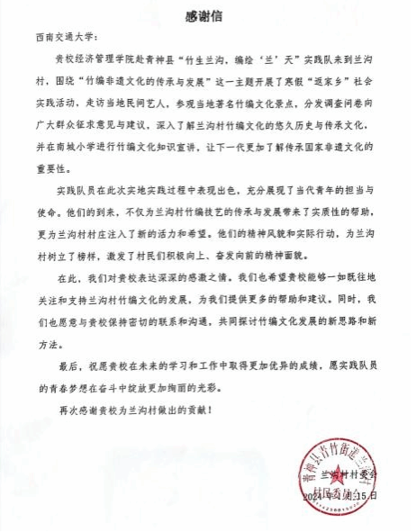 2024年寒假期间,西南交通大学经济管理学院“竹生兰沟,编绘‘兰’天”调研走访实践队来到四川省青神县兰沟村开展以“深挖青神竹编,宣扬非遗文化”为主题的五天调研实践活动。实践团队首先抵达中国竹编艺术博物馆进行参观,并在第二天拜访了殷超竹编工作室,随后调研团队前往采访了国际竹编大师陈云华老师。小组成员抵达兰沟村居民点后,实地走访居民65户。此外,实践团队还来到青神县南城小学进行传承非遗文化主题宣讲,鼓励他们努力学习、接续传承。南城小学特此为实践团队颁发了感谢信。