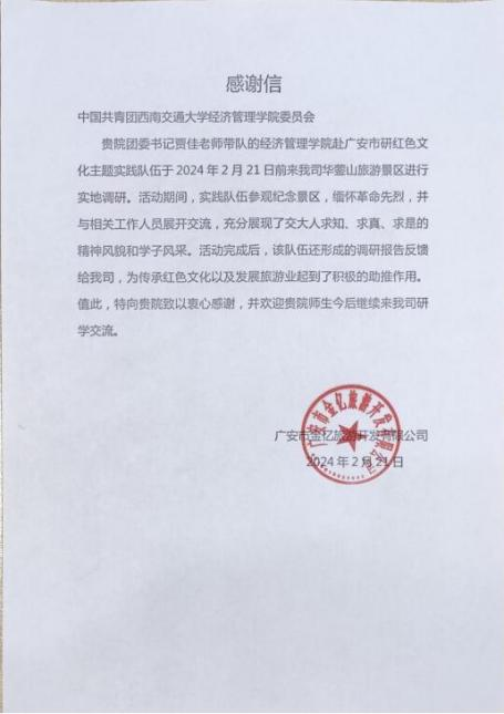 2024年2月20日,西南交通大学经济管理学院实践队在团委书记贾佳、副书记苏扬老师的带领下,前往四川省广安市开展寒假“返家乡”社会实践活动。实践队首先来到邓小平故里参观调研,感受邓小平同志的伟大人格和崇高精神。参观结束后,实践队成员们分发问卷,与游客亲切交流,收集他们的意见和建议,共同探寻红色文化的深厚底蕴。第二天,实践队继续深入广安,探访了华蓥山。在结束实地参观后,实践队与广安市金亿旅游开发有限公司总经理曾辉开展了研讨座谈会并分享了队伍对广安红色旅游发展的看法。实践活动结束后,团队收到了来自广安市金亿旅游开发有限公司的感谢信。