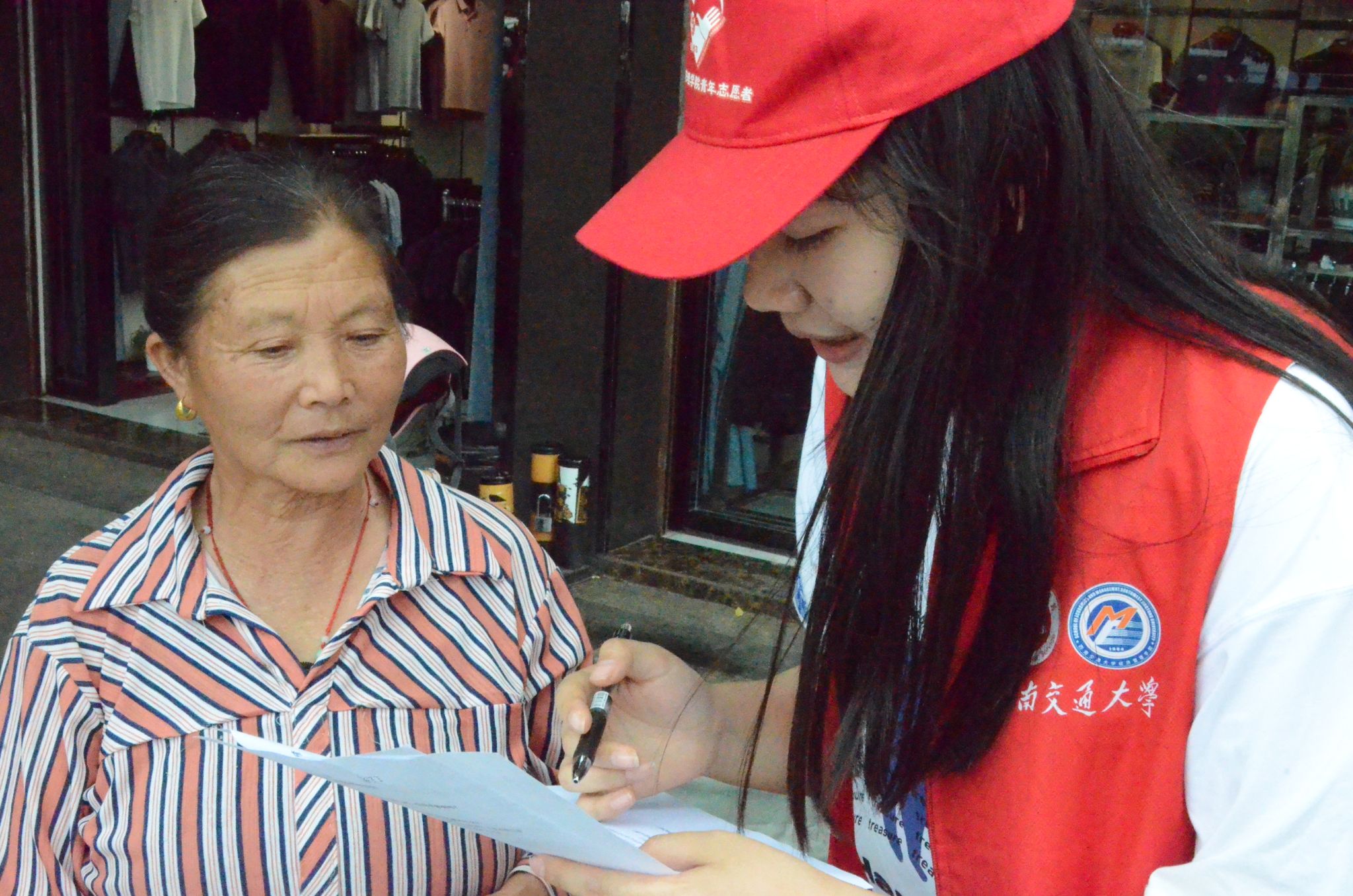 活动第二天,团队成员深入会东县街头巷尾,以发放调查问卷,街头随机采访等形式,收集并了解了当地居民的普通话使用习惯,使用频率,使用场景等,并询问了他们对于普通话学习的意愿以及对推广普通话活动的看法。本次共发放问卷120份,回收问卷116份,回收率达96.6%。分析问卷结果可知,会东县许多50岁及以上的人不擅长普通话,更多使用方言进行交流,这源于他们普遍缺乏系统的教学以及讲普通话的环境和习惯。而在对于推广普通话活动的看法上,绝大多数人持赞成与支持的态度,并对学习普通话有较高的意愿。