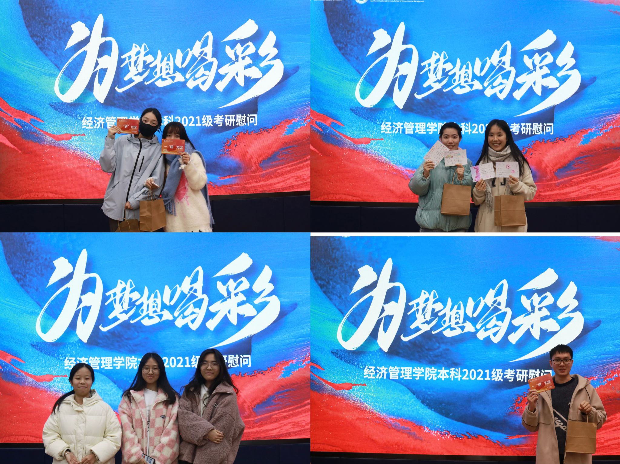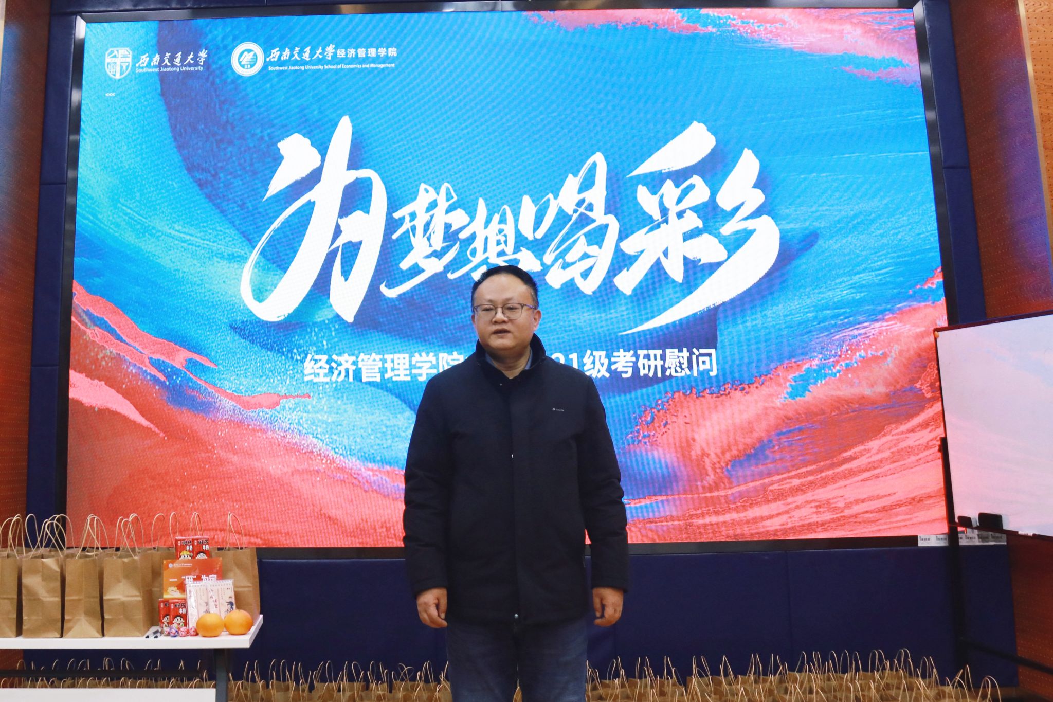 在考研冲刺的关键时刻,为激励即将踏上考场的经济管理学院学子,传递学院的关怀与鼓励,2024年12月5日上午11时,西南交通大学经济管理学院在J0218教室为2021级考研学生精心准备了一场考研慰问活动。