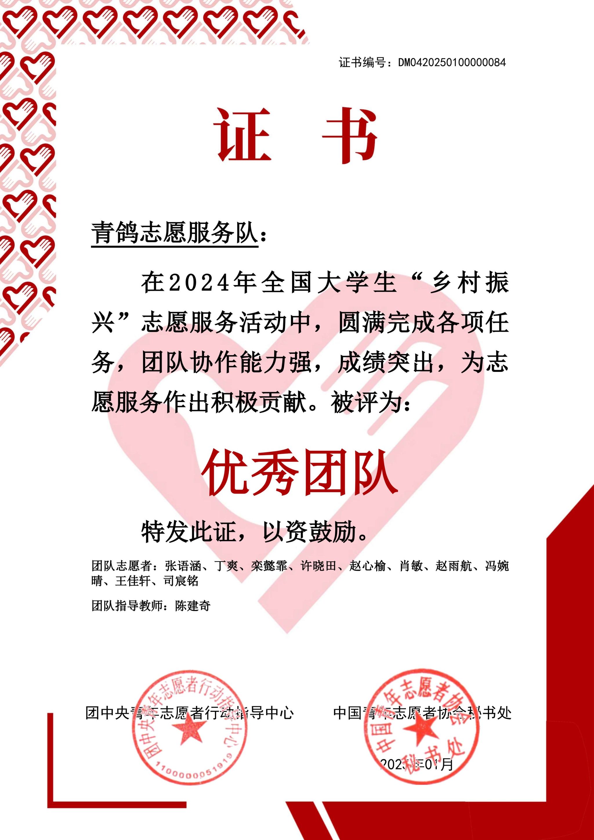 为深入学习贯彻习近平新时代中国特色社会主义思想和党的二十大精神,落实“强国复兴有我”群众性主题宣传教育活动相关要求,服务全面推进乡村振兴,动员引导青年学生投身乡村振兴一线,中国农业发展银行、团中央青年志愿者行动指导中心联合开展了2024年全国大学生“乡村振兴”志愿服务活动。西南交通大学经济管理学院青鸽志愿服务队“乡村振兴”志愿服务团凭借其出色的表现和显著的成绩,荣获优秀团队。