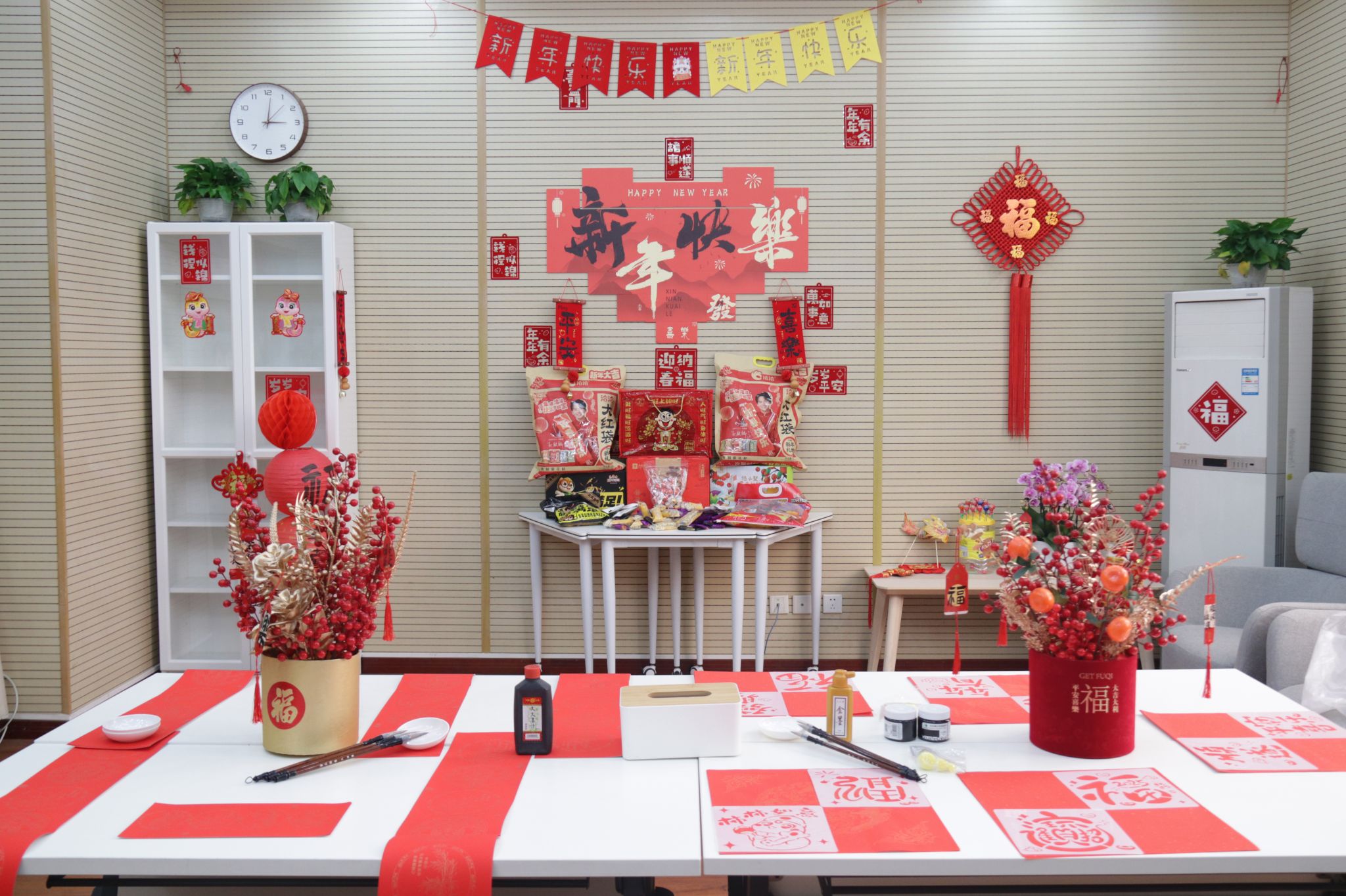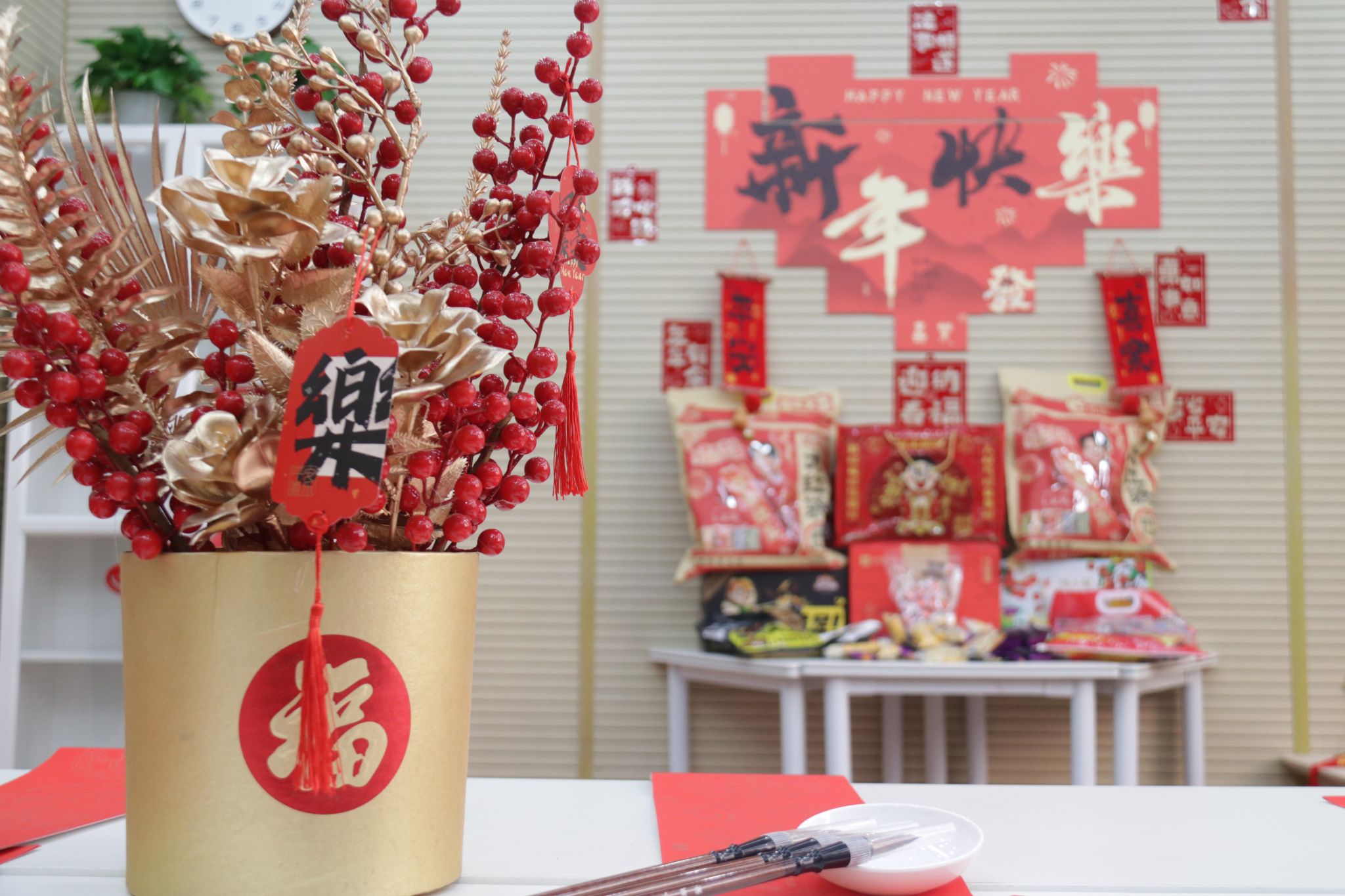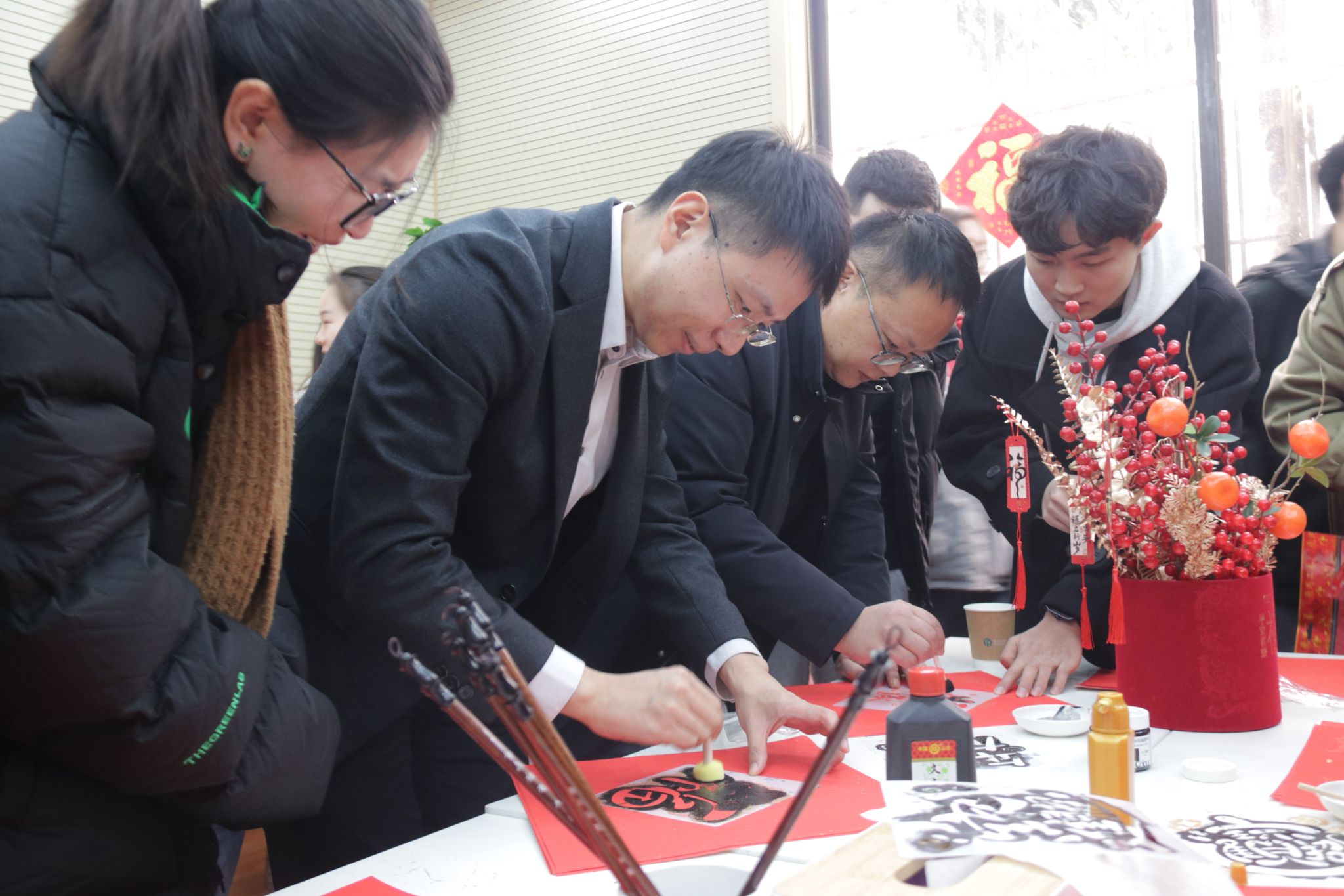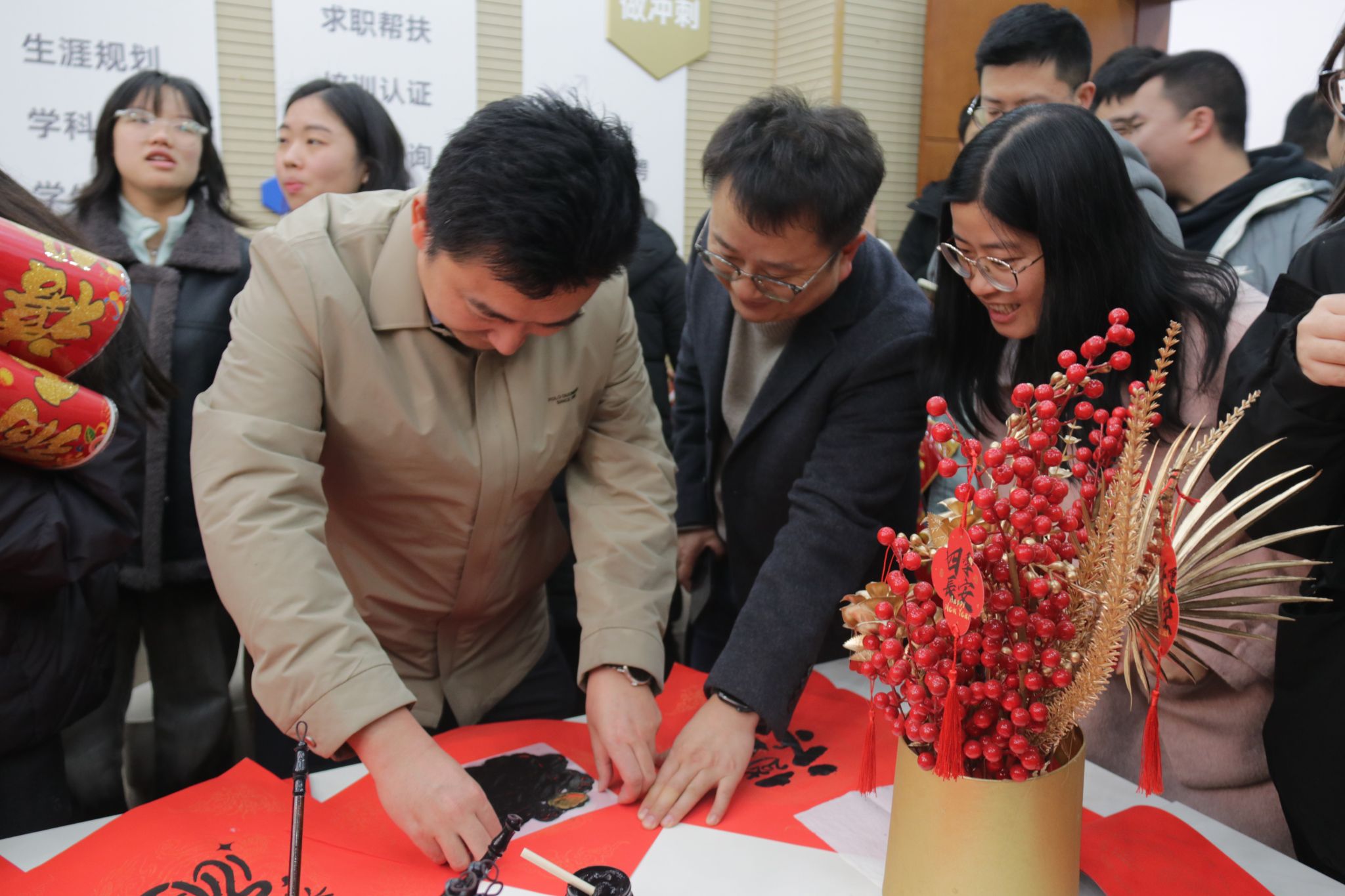 辞旧迎新巳福到,挥毫展墨迎新春。师生们笔走龙蛇,多种书体各显神韵,一幅幅苍劲有力的春联、一张张喜庆祥和的“福”字跃然纸上。春联与福字不仅代表着祥蛇贺岁、辞旧迎新的美好愿景,同时也蕴含着歌颂祖国、大展宏图的励志高歌。整个活动现场仿若一片喜庆的红海,被随风轻摆的红色春联和饱含神韵的“福”字映衬得年味四溢,这些满含深情的笔墨作品,承载了师生们对新年幸福吉祥的祈愿,也展现出传统书法与新春佳节完美融合的独特魅力。