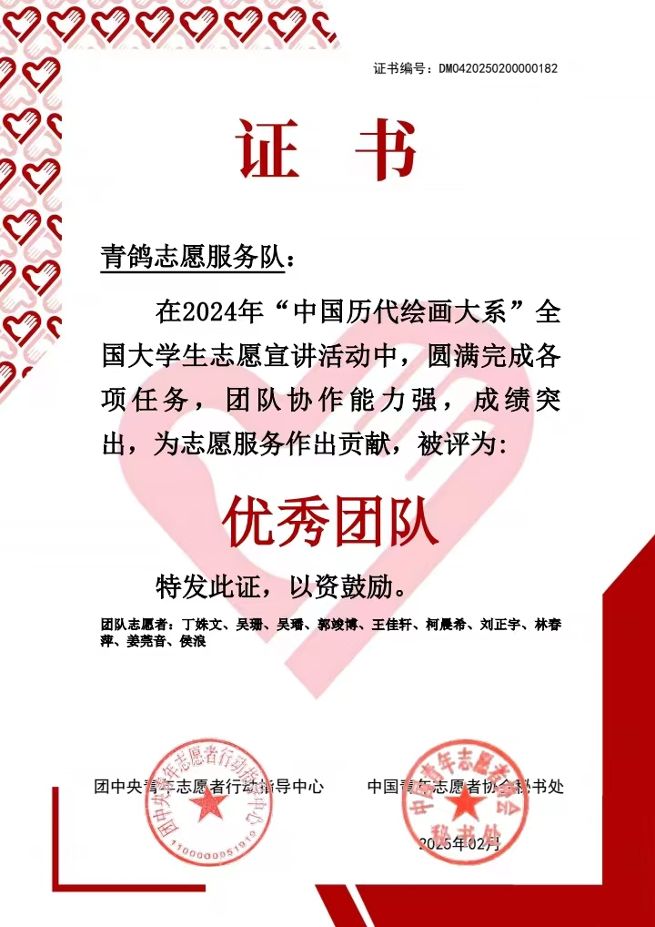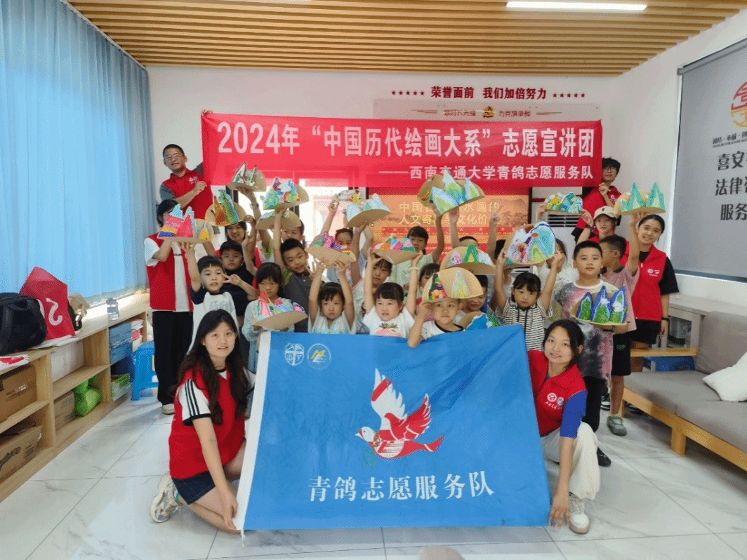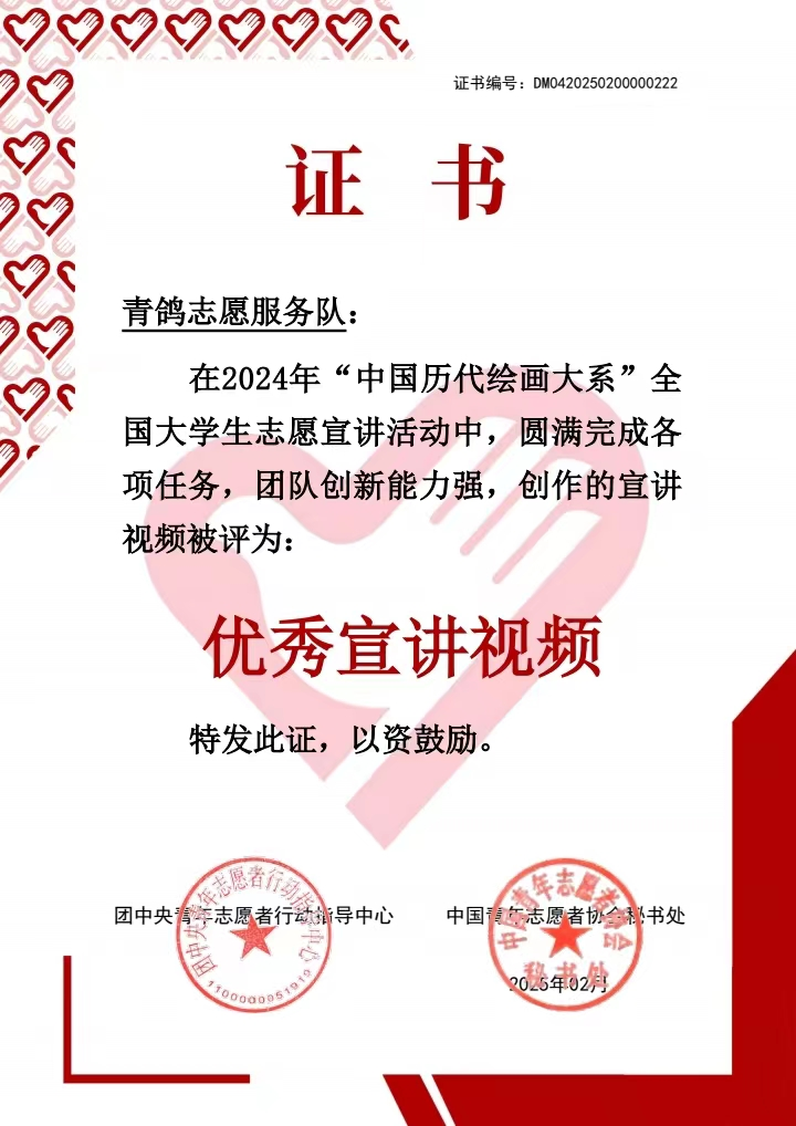 为深入学习贯彻习近平文化思想及党的二十大精神,积极响应“强国复兴有我”群众性主题宣传教育活动的相关要求,促进中华优秀传统文化的传承发展与国际交流,团中央青年志愿者行动指导中心、教育部中外语言交流合作中心、中国外文局文化传播中心、浙江大学与中国文物报联合开展了2024年“中国历代绘画大系”全国大学生志愿宣讲活动。近日,在宣讲服务团评选活动中,西南交通大学经济管理学院青鸽志愿服务队以其优异的表现,荣获“优秀团队”;同时,团队精心创作的活动视频被评选为“优秀宣讲视频”。