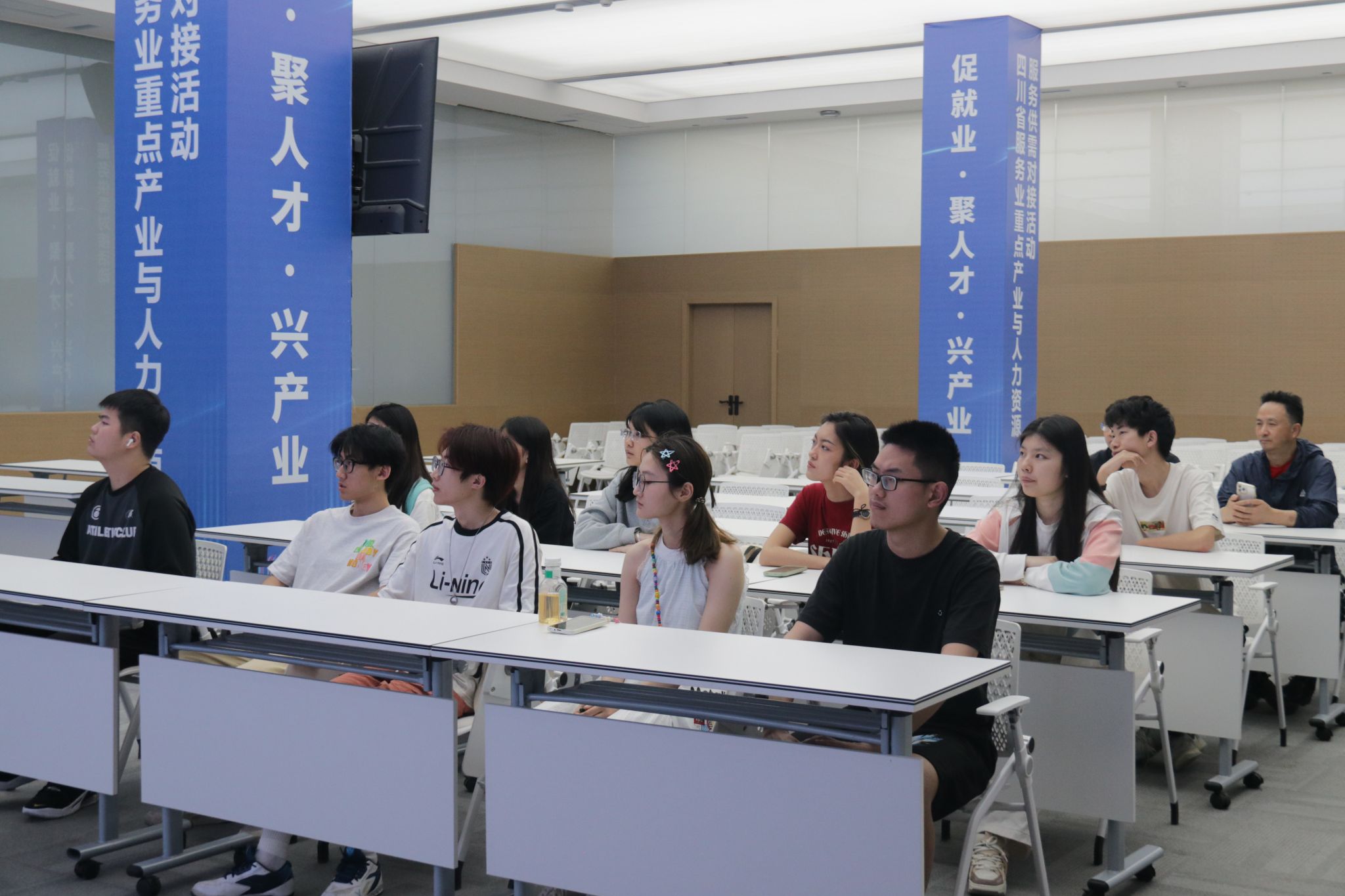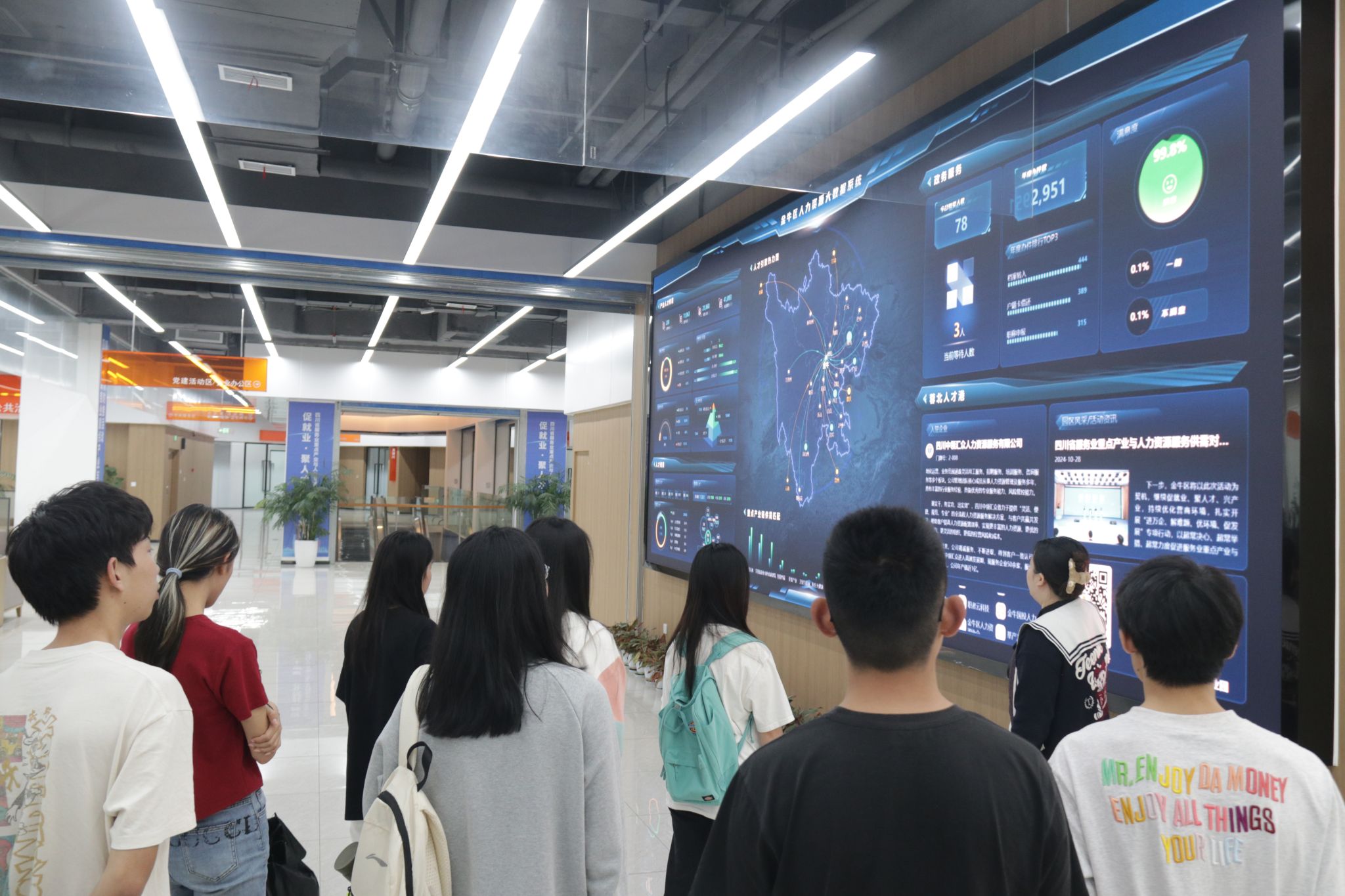 活动伊始,同学们在蓉北人才港工作人员的带领下,系统参观了人力资源服务产业园的数字化运营场景,深入了解人才招聘、职业培训、产教融合等全链条服务体系。通过实时数据看板、智能匹配系统等展示,同学们直观感受到金牛区在人力资源产业集聚与智慧化服务中的创新实践。一名本科学生表示:“原来人才服务已从传统中介转向技术驱动的生态化平台,这为我们的职业规划提供了更广阔的想象空间。”