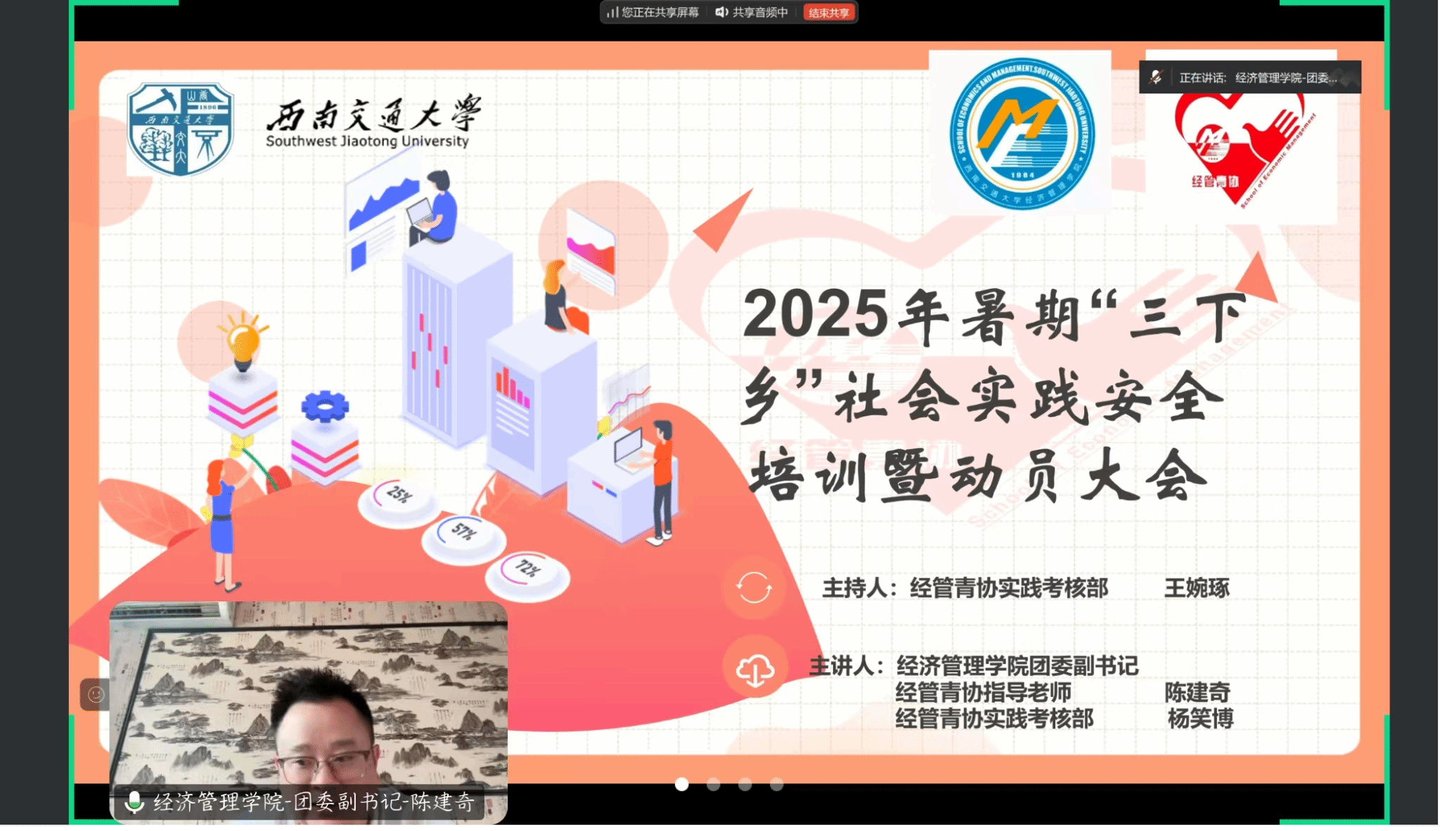 经济管理学院团委积极响应学校号召,持续打造“1225”实践育人平台,精心组织、周密安排,成功申报并立项多支校级、院级和专项队伍。为提高大学生参与社会实践活动的安全意识、避险常识和应急自救能力,同时激发大学生参与实践活动的热情。2025年7月6日下午3点30分,经济管理学院2025年暑期“三下乡”社会实践安全培训暨动员大会在线上举行,学院团委副书记陈建奇、青年志愿者协会干部以及24支校级、院级以及专项队伍一起参加了大会。