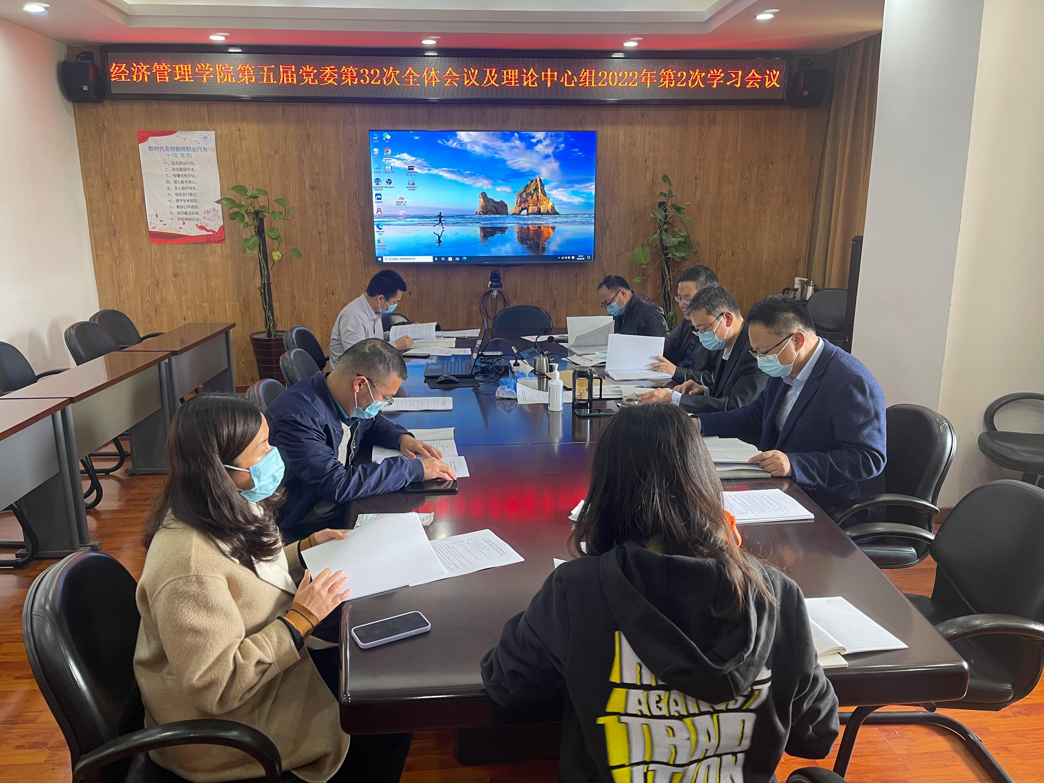 2022年4月6日下午2:00,学院第五届党委2022年第2次理论学习中心组学习、第32次全体会议在九里校区零号楼0607会议室召开。会议由学院党委书记王斌主持。