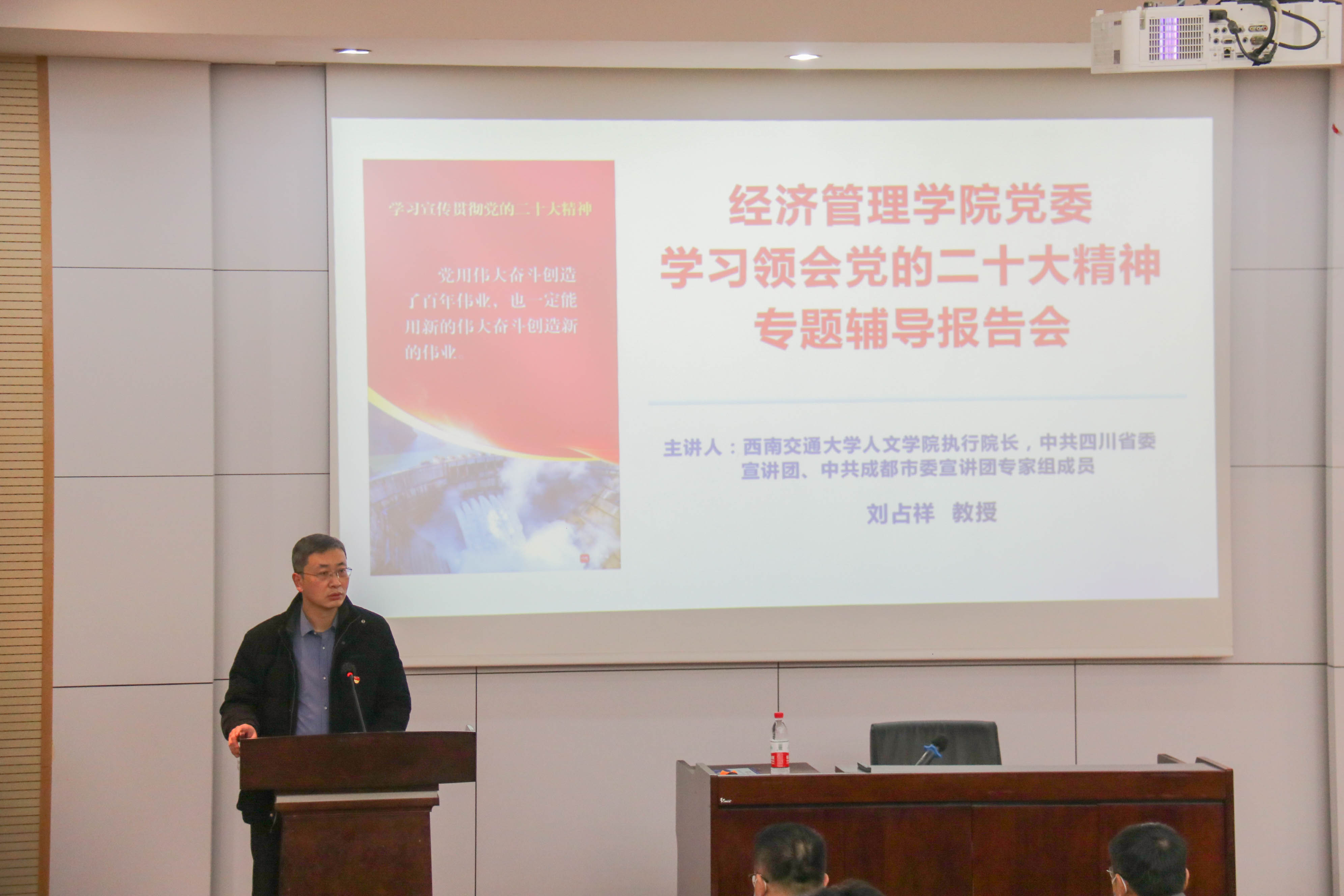 12月8日下午,经济管理学院党委邀请西南交通大学人文学院执行院长,中共四川省委宣讲团、中共成都市委宣讲团、西南交通大学宣讲团专家组成员刘占祥教授作了题为“自信自强、守正创新、踔厉奋发、勇毅前行——深入学习贯彻党的二十大精神”的专题辅导报告,学院党政领导班子、师生各党支部委员、党外知识分子、机关工作人员共100余人参加了报告会。报告会由学院党委书记王斌主持。