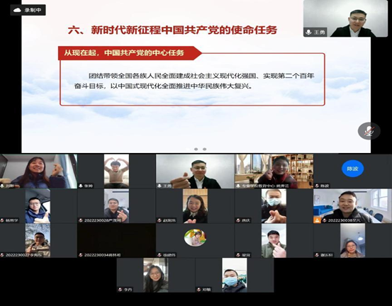 2022级MEM临时党支部以线上会议形式开展了学习贯彻党的二十大精神主题党日活动,班主任姚霁芸老师出席本次活动。党支部书记王勇宣讲了“深入学习宣传贯彻党的二十大精神”专题党课,与会师生结合自身工作、学习情况,进行了广泛的交流发言。通过学习、交流,每个党员深刻地认识到,要从自身学习、工作实际出发,认真学习和贯彻执行党的二十大精神,站在当今时代大变革的潮头,要学会适应变化,勇于直面困难,不要被困难所定义;要善于思考,善于总结过去的得失,持续发扬长处,不断改进不足;要做好对未来的规划和展望,既要脚踏实地、又要抬头看天,紧跟党的二十大精神,把握时代发展的脉搏,指导我们的实践;要照顾好自己,才有能力去做贡献和奉献,在后疫情时代平衡好学业、工作和家庭的关系。