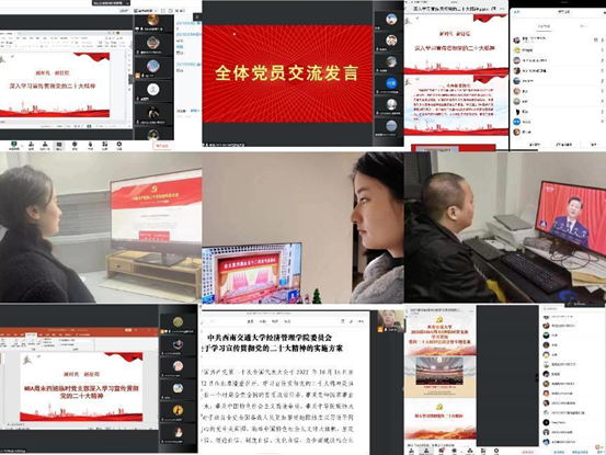 为了深入学习领会和贯彻落实党的二十大精神,按照“中共西南交通大学经济管理学院委员会关于学习宣传贯彻党的二十大精神的实施方案”有关安排,学院非全日制专业学位研究生各班级临时党支部积极行动,克服疫情影响,通过开展主题党日活动、分组学习等多种形式,读原文、悟原理、谈感想,进行学习研讨,掀起学习贯彻党的二十大精神的热潮。