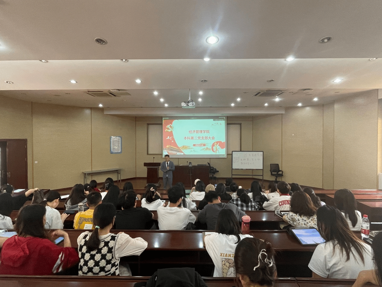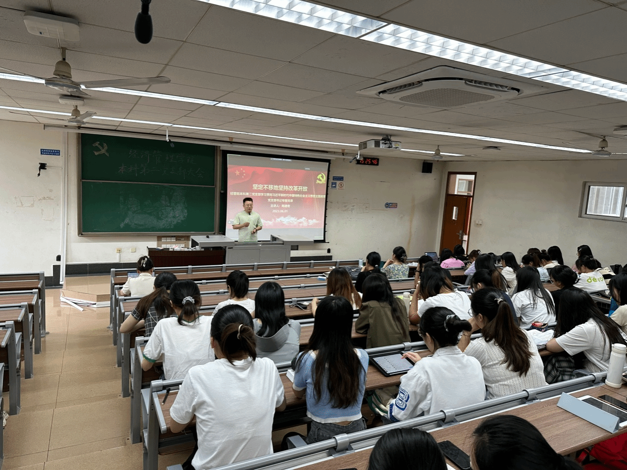6月8日,经济管理学院本科第二党支部邀请党支部联系党委委员、副书记杨宏毅为党支部成员讲授专题党课,加强理论学习,接受思想洗礼。杨宏毅以《深入学习贯彻党的二十大精神》为题,围绕党的二十大报告,从八个方面出发,带领党支部全体成员深学细悟,全面系统深入学习领会党的二十大精神,引导广大党员树立远大理想,担当时代责任。