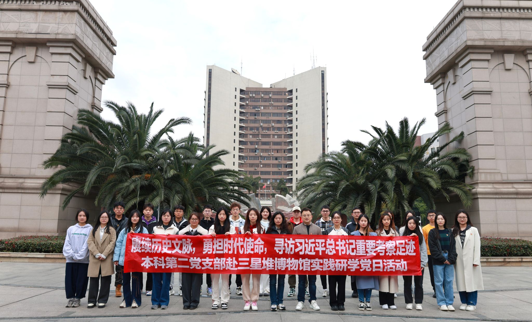 为扎实推进学习贯彻习近平新时代中国特色社会主义思想主题教育,深入贯彻落实习近平总书记在四川考察时的重要指示精神,弘扬传承中华优秀传统文化,坚定文化自信,建设文化强国,11月30日,经济管理学院本科第二党支部24名党员、入党积极分子在学院党务秘书李洪辉、本科第二党支部书记陈建奇的带领下,前往广汉市三星堆博物馆,开展“赓续历史文脉,勇担时代使命,寻访习近平总书记重要考察足迹——三星堆博物馆实践研学”主题党日活动。