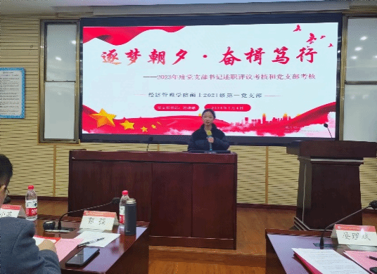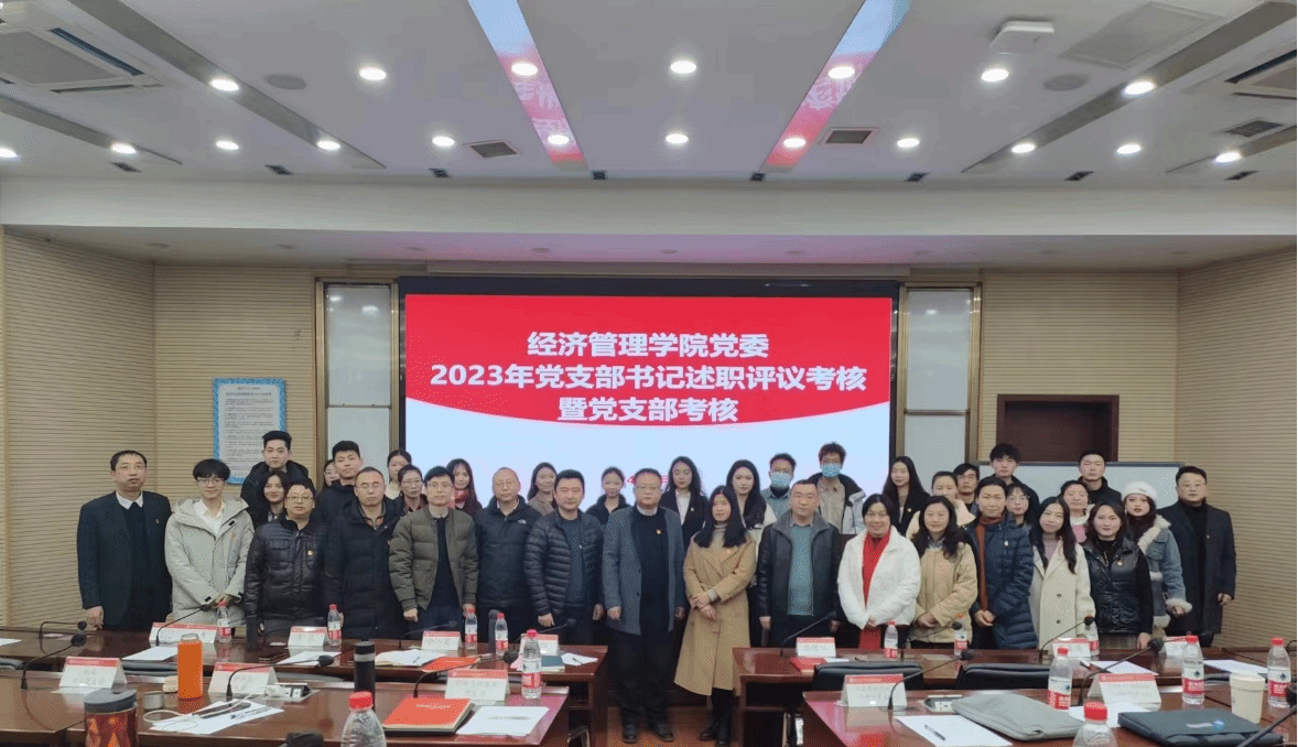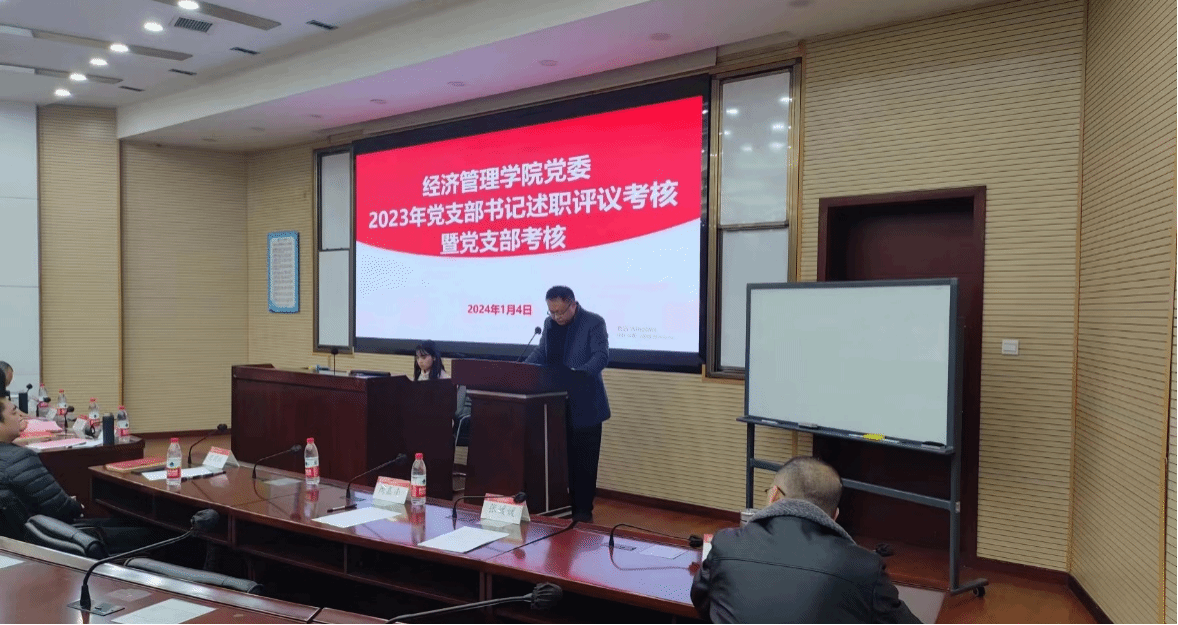 2024年1月4日下午,经济管理学院党委2023年度党支部书记述职评议考核和党支部考核会议在九里校区零号楼0204教室举行。学院领导班子成员、党委委员、专职组织员以及师生各党支部书记参加并完成了现场考核评分,会议由学院党委书记郭强主持。