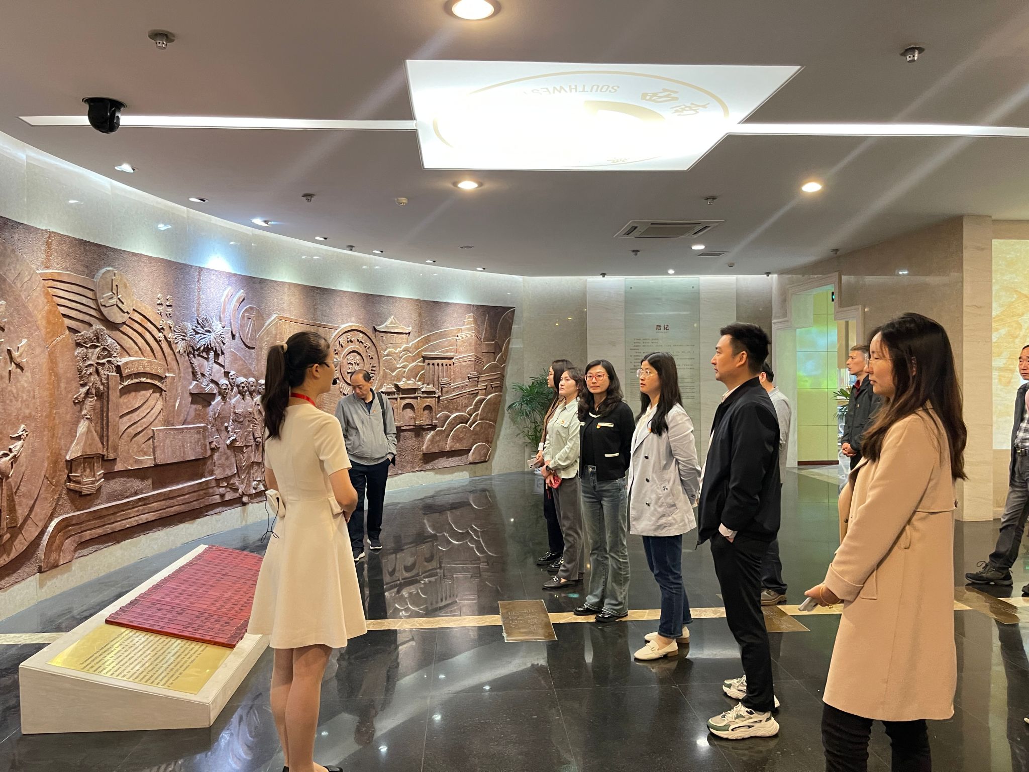 西南财经大学校史馆位于柳林校区核心区域,馆内陈列着丰富的历史资料和珍贵的文物。在校史馆讲解员的引导下,党员同志们依次参观了序厅、日月光华、丹心铁卷、鲲激鹏举、云帆远济等展区。通过珍贵的历史文献、翔实的图文资料以及实物展品,深入了解学校自创建以来的发展历程和取得的辉煌成就,以及各个时期的办学成果和名人事迹。
