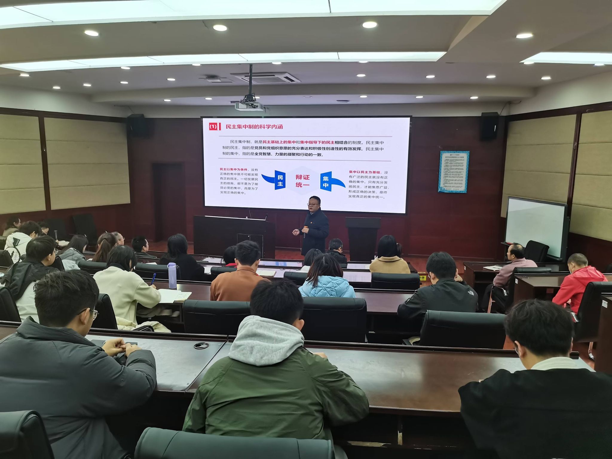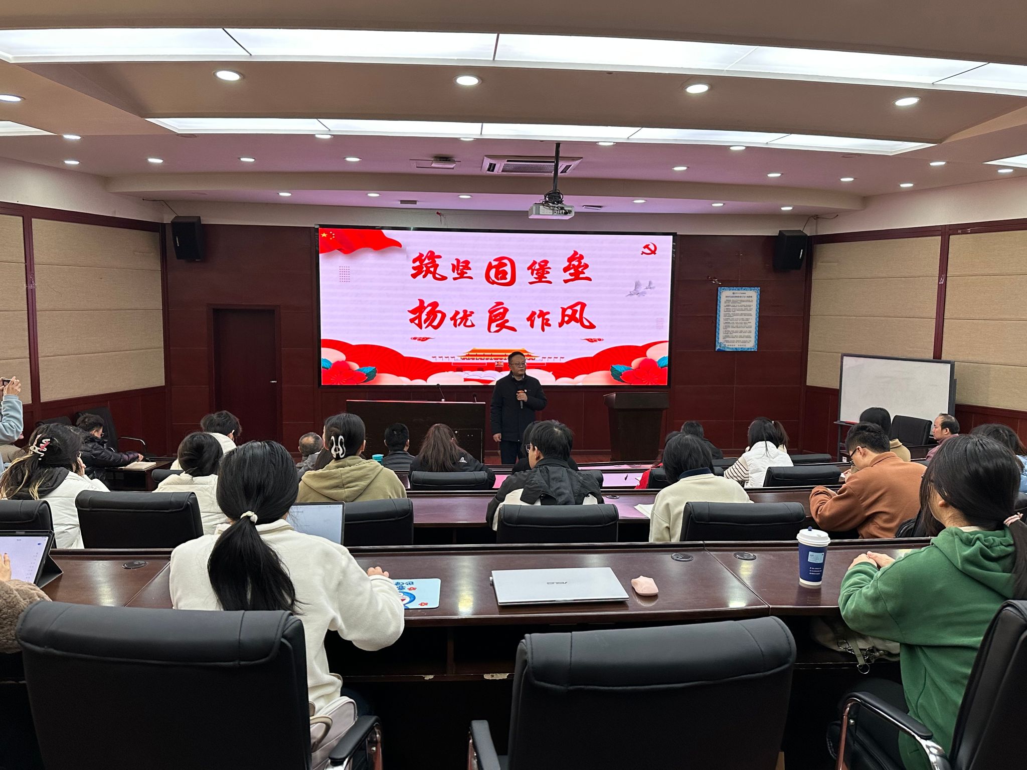 2024年11月28日上午10点半,经济管理学院党委在零号楼J0228教室开展党委书记讲党课活动,本次专题党课由学院党委书记郭强主讲,学院党委副书记晏理斌、师生党支部委员和党员代表近40人参加了本次党课。